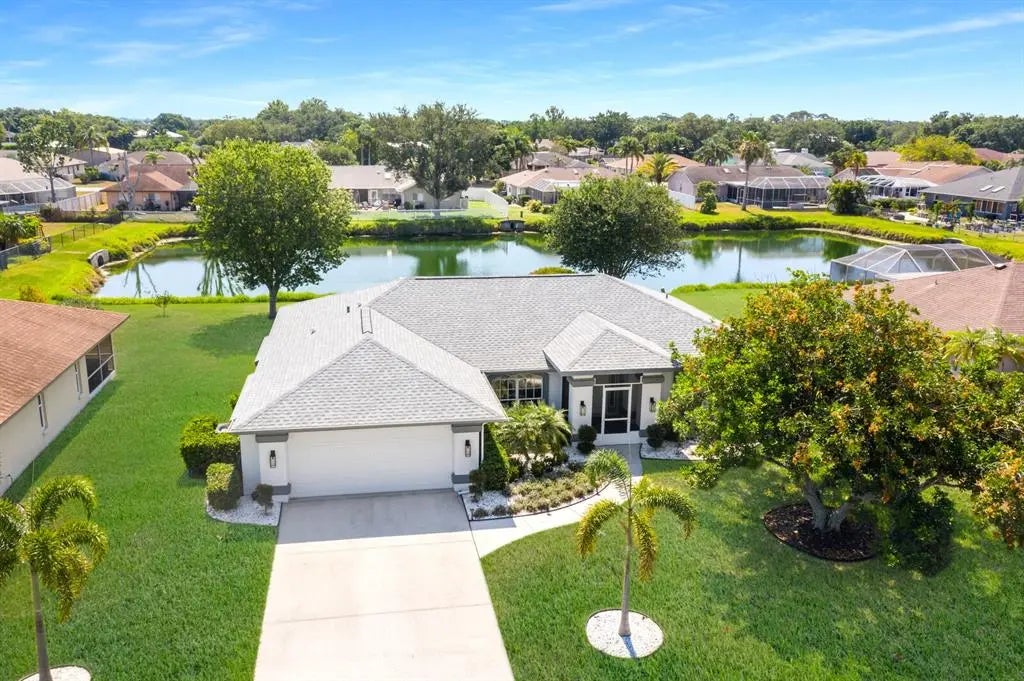 Welcome to your serene retreat in the heart of the tranquil Manatee Oaks with water views from multiple rooms. This charming three-bedroom, two-bath, single-family residence offers 1,726 square feet of comfortable living space and is on a private, over 10,000-square-foot lot. The mature landscaping and high curb appeal immediately draw you in, showcasing the home's welcoming entryway and the attached two-car garage. Step inside to a light and bright open floor plan with a neutral palette, ready for your personal touches. The spacious interior features comfortable carpet in the bedrooms and new luxury vinyl plank flooring in the main areas. High ceilings with modern ceiling fans and custom lighting throughout enhance the airy atmosphere, while stone counters and walk-in closets add a touch of luxury. The well-appointed kitchen provides ample counter space and comes fully equipped with a dishwasher, fridge, microwave, and stunning water views to enjoy while cooking. The primary bedroom offers a peaceful retreat with its own ensuite bath which includes an exquisite standalone tub, separate walk-in-shower, and a dual sink vanity. Window treatments in bedrooms include custom cordless pull-down shades. Relax on the rear screened patio overlooking lush greenery and a serene pond, perfect for unwinding after a long day. This home is centrally located with quick access to grocery stores, restaurants, parks, recreation facilities, and shopping, with easy access to the beaches and Sarasota. This is a HOA community with little deed restrictions. This delightful home provides the perfect blend of convenience and comfort. Don't miss this opportunity to make this beautiful home yours – schedule a showing today.