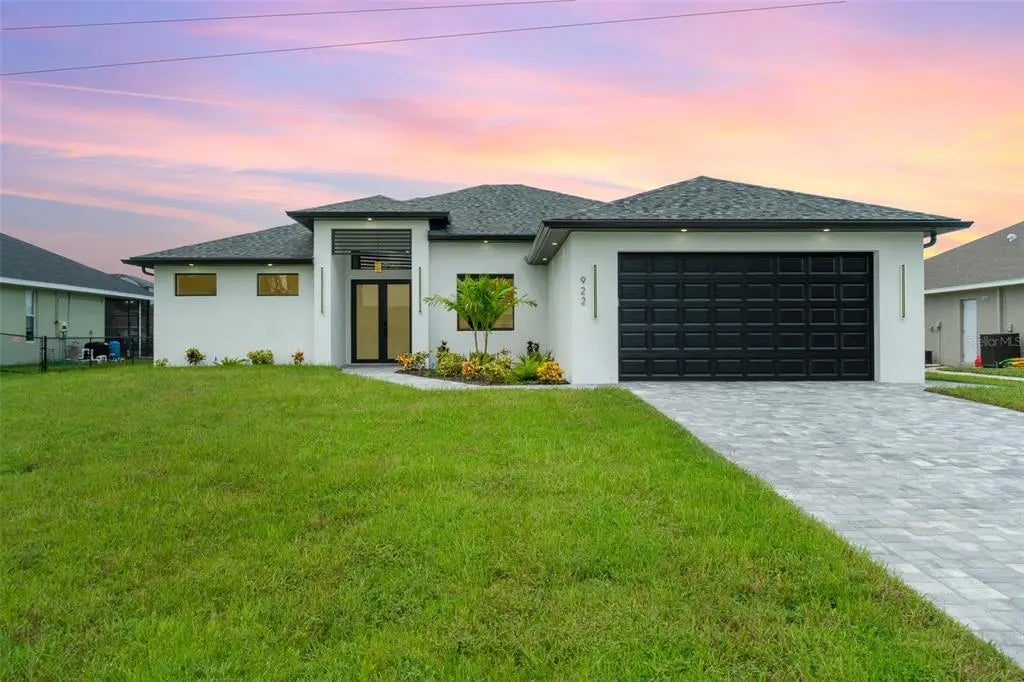 Welcome home to this amazing new construction oasis with 4 bedrooms, 3 bath and 2 car garage pool home on a canal in Cape Coral! This new construction home offers great attention to detail, quality, style and exquisite touches!!! This waterfront pool home is just beautiful and stands out because of the colors, hardware, stone work, custom walls and all of the plentiful upgrades. The custom builder designed this home with all the bells and whistles. From the first impression and the curb appeal, this stylish home offers luxurious touches. Entering the home, you are welcomed from the foyer into an open living space and high trey ceilings. There are tan plank tiles throughout the flooring of the home, a fireplace wall with wood surround, and a stunning chefs’ kitchen with waterfall quartz island and views that showcase the pool and canal. The fourth bedroom was designed to be easily converted to an office with it's double doors and built in shelving.The kitchen has 42’ white wood cabinets. All high end LG stainless steel appliances have hideaway outlets and phone chargers. All windows, sliders and doors are impact resistant. Large primary bedroom offers 2 walk-in closets with an attached, enormous custom bath. The spa-like bath has double sinks with quartz counters and a shower that has to be seen to be believed. The home also has 3 additional bedrooms, 2 with walk in closets. The two additional baths (one also being a pool bath) are also beautifully designed to satisfy the most discerning buyer. Even the laundry room has a quartz sink and is fully complemented with cabinets. Outside is an entertainer’s dream!! Beautiful pool with sun shelf, large covered seating area, custom built in outdoor kitchen with grill, sink and refrigerator, enormous poolside lounge area all encompassed by a caged lanai with large picture window screens overlooking your beautiful canal view. Peaceful water views and yet so convenient to shops and restaurants. Flood zone X- NO flood insurance required.