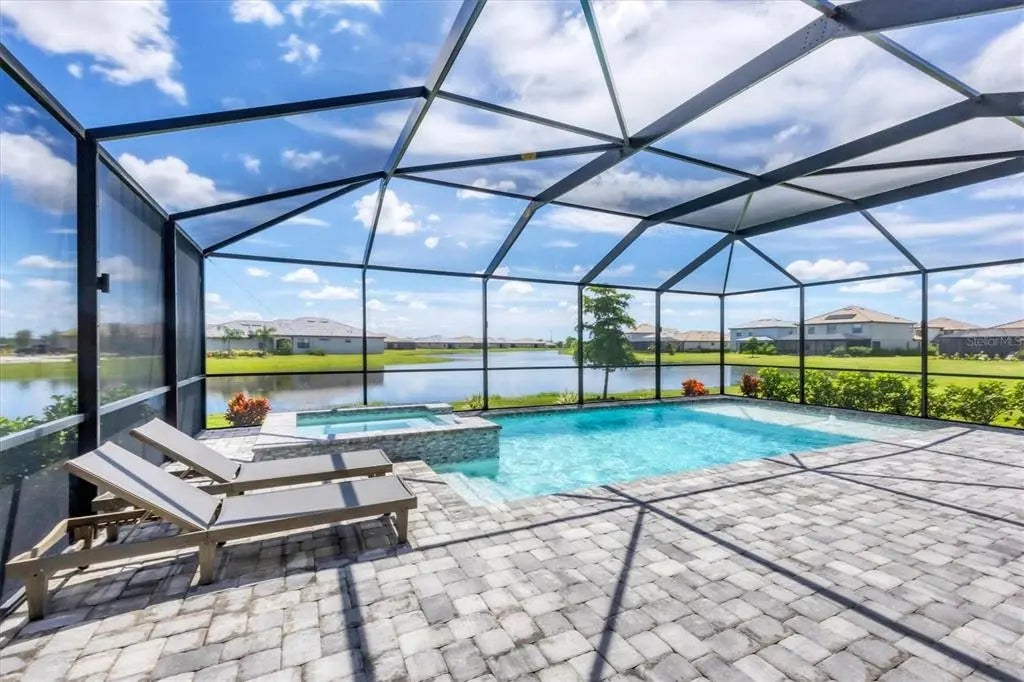 **NEW PRICE IMPROVEMENT** Welcome to your dream home in the amenity-rich community of Lorraine Lakes! Located in Lakewood Ranch, this stunning 3,200 sq/ft Monte Carlo model boasts five bedrooms, three bathrooms, a three-car garage. The 15x30 custom salt water pool features a hot tub and a sun shelf. Relax and entertain on the beautiful screened-in extended lanai overlooking the water. Built in 2022, this home features a whole house water filtration system with a reverse osmosis kitchen faucet, ceiling attached garage storage units, and a spacious open floorplan with high ceilings and tons of natural light. The kitchen showcases a herringbone backsplash and modern appliances, including a gas range and upgraded refrigerator. Located in the sought-after Lorraine Lakes community, residents have access to the amenity center with two pools, a splash pad, indoor/outdoor bar and restaurant, pickleball, tennis, basketball, putting green, bocce ball, volleyball, arcade, café, fitness center, TRX room, playroom, sauna, community room, and a full-time lifestyle director. Enjoy a variety of events such as trivia nights, holiday brunches, luaus, wine tastings, country line dancing lessons, mixers, and more. With convenient access to major highways, gated entry with a 24-hour guardhouse, and a prime location not far from shopping, dining, and entertainment, this home offers the ultimate in luxury living. Don't miss out on this incredible opportunity to own a piece of paradise in Lorraine Lakes. Contact us today to schedule a private tour! Garage fridge does not convey. All MLS information is to be confirmed by the buyer's agent/buyer during inspection period.