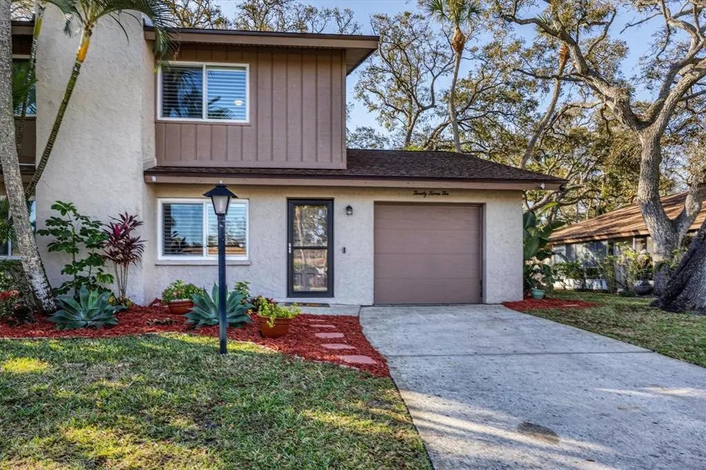Seller will consider buyer concession of $5,000 for closing costs or rate buy-down. Exceptionally rare, move-in ready, maintenance-free townhome in Woodland Village! This is one of only two townhomes in the community and features two bedrooms, two and a half baths, and attached garage. Rest easy with NEW ROOF, IMPACT WINDOWS, and new HVAC installed in 2020. Discover comfort and convenience in this inviting townhouse, nestled among the majestic oaks this charming neighborhood is known for. Featuring a functional layout, the main living areas are situated downstairs along with a convenient powder bath. The living room greets you into this cozy haven with wood flooring and plantations shutters, offering durability and charm. The kitchen offers newer stainless steel appliances. The dining room is adjacent, while the convenient breakfast bar overlooks the family room and is ideal for everyday cooking and casual dining. Upstairs, you'll find two comfortable, ensuite bedrooms with full baths. Benefit from the rare one-car garage with durable checkerboard flooring, providing ample storage space for laundry, vehicles and belongings. The screened lanai is surrounded by mature landscaping and trees creating a serene atmosphere for outdoor enjoyment. Woodland Village is a small community with affordable fees, no age restrictions and pet friendly, allowing 1 pet up to 30 lbs. The clubhouse is a great gathering spot for the residents with a kitchen and a heated pool so you can enjoy swimming all year-round. Centrally located, convenient to shopping, restaurants, IMG Academy & SCF campuses and a 15-minute drive to the gulf beaches.