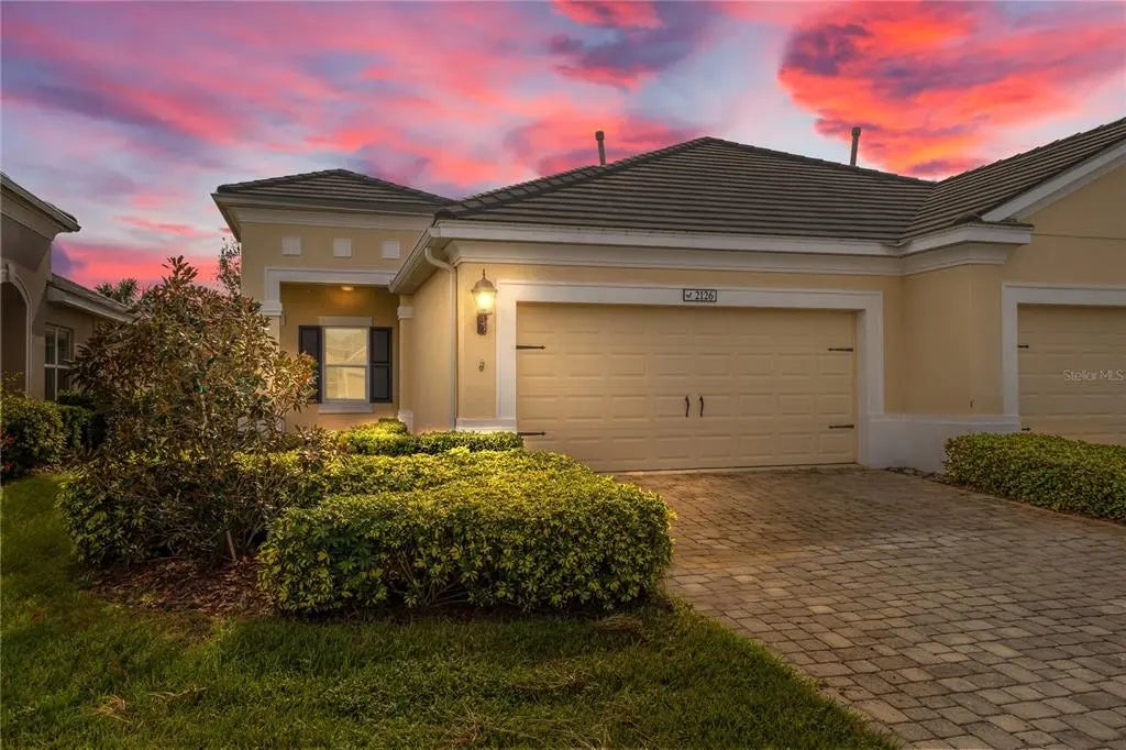 One or more photo(s) has been virtually staged. Welcome to this beautifully designed 2-bedroom + den, 2-bathroom home in a sought-after low-maintenance community of Eagle Trace. Boasting 1,452 square feet of thoughtfully crafted living space, this residence is perfect for those seeking comfort and modern convenience. The open floor plan is adorned with ceramic wood-look tile and enhanced by tall ceilings, creating a warm and inviting atmosphere. The split floor plan ensures privacy, with the primary suite featuring double vanities, a spacious walk-in shower with updated tile, and plenty of closet space. The kitchen is a chef’s delight with a gas stove, 42” white shaker cabinets with granite, as well as a lovely island with ample room to prepare your favorite meals. Step outside to your private lanai, complete with a retractable awning for added shade and comfort, making it the perfect spot to relax or entertain. This CDD free community offers an array of amenities, including pickleball courts, small and large dog parks, a resort-style pool featuring two BBQ grills and a playground—a lifestyle designed for leisure and enjoyment.