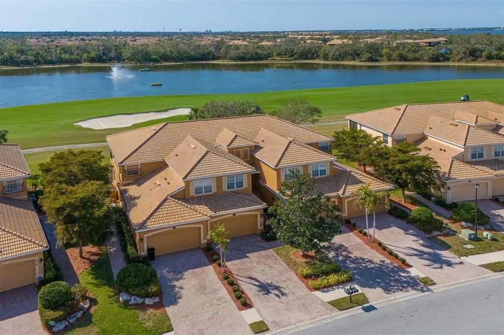 Enjoy breathtaking golf and water views from this beautifully furnished second-floor condo in 24-hour gated community of River Strand Golf & Country Club. This spacious 3-bedroom, 2-bathroom home features a desirable split floor plan, an open-concept living area, and a screened-in lanai accessible from both the living room and primary suite. The primary bedroom boasts two walk-in closets, offering ample storage. Brand-new AC and water heater (installed 2025). As a golf-deeded property, this home provides access to the 27-hole championship golf course, 9 Har-Tru clay tennis courts, 8 pickleball courts, and 6 satellite pools. The 39,000 sq ft clubhouse offers a full-service restaurant, Tiki bar, fitness center, aerobics room, resort-style pool, resistance pool, and heated spa. Don't miss this rare opportunity to own a condo in one of the area’s most sought-after communities!
