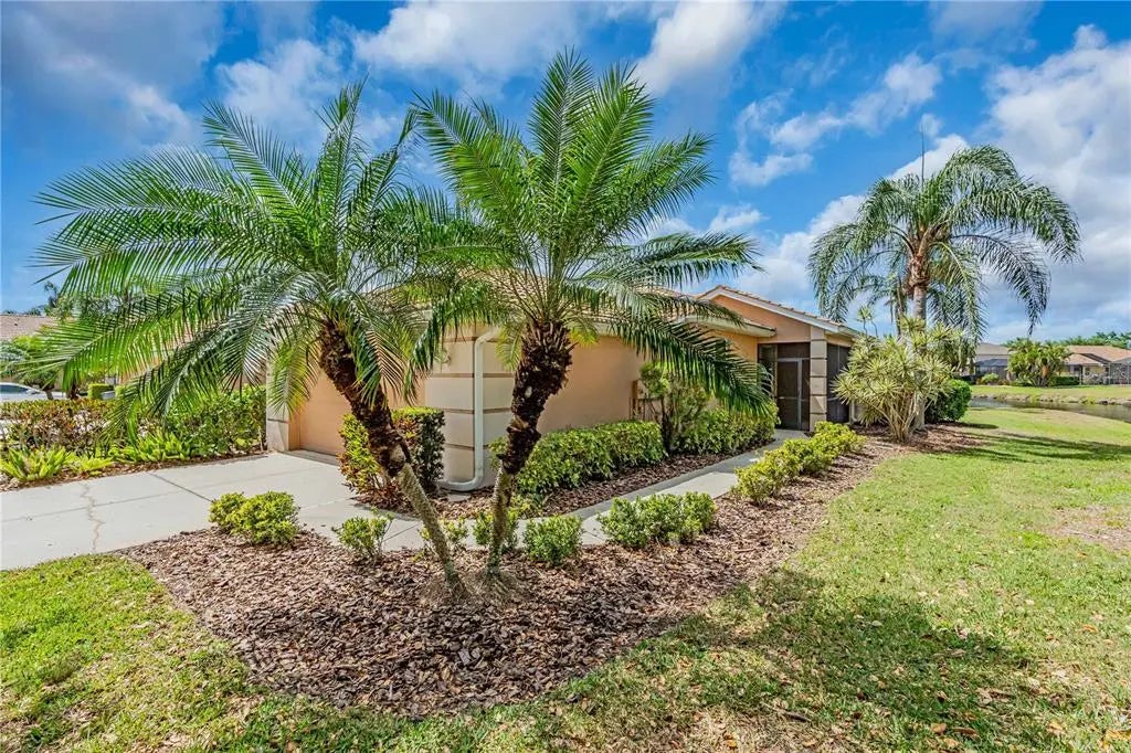 A rare opportunity to own one of only two stand-alone villas in the highly sought-after Fairway Greens at Stoneybrook. This beautifully maintained 2-bedroom, 2-bath villa with a versatile den and a 2-car garage offers nearly 1,900 square feet of single-level living and the perfect blend of comfort, privacy, and style. Nestled at the end of a quiet cul-de-sac with no neighbor on one side and a tranquil pond view in the back, the home offers a sense of seclusion that’s hard to find. Enjoy breathtaking sunsets from the oversized screened lanai with fully retractable sliders or relax on the charming screened front porch. Inside, you’ll find a freshly painted interior, newer Brazilian tigerwood floors, and a 2023 HVAC system. The open floor plan features a formal dining area, a flexible den, and a bright living space designed for everyday comfort and entertaining. The kitchen is light filled thanks to a skylight and offers wood cabinetry, stainless steel appliances, a backsplash, and a pantry with custom shelving. The primary suite is a peaceful retreat with pond views, ample natural light, dual closets, including a California-style walk-in, and a spacious en-suite bath with dual vanities, a soaking tub, and a separate shower. The laundry room includes its own skylight, linen closet, cabinet storage, deep utility sink, and washer and dryer that convey. The maintenance fee covers all exterior upkeep—including the tile roof, landscaping, irrigation, and building structure—providing true peace of mind. Stoneybrook offers resort-style amenities, including heated pools, spa, 24-hour fitness center, recreation center with scheduled activities, tennis, pickleball, bocce, corn hole, basketball, volleyball, ball fields, dog parks, fishing pier, nature trails, playgrounds, and picnic areas. The community also features a beautifully maintained 18-hole public golf course with memberships available or pay-as-you-play access. The Heritage Harbour Golf Club includes a welcoming restaurant with entertainment and social events year-round. Centrally located near I-75, Costco and numerous upcoming dining and shopping options, Lakewood Ranch, UTC Mall, Ellenton Outlets, and just a short drive to the world-renowned beaches of Anna Maria Island and Siesta Key, this home truly offers the best of Florida living.