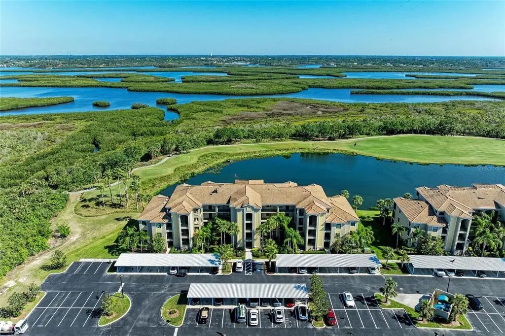 JUST REDUCED! FANTASTIC VALUE ON THIS TOP FLOOR, TURNKEY residence in the gated resort community of River Strand Golf and Country Club! This one stands out as the views are Simply Spectacular and begin the minute you walk in the door! With views from the main living area and your private screened lanai, you will enjoy panoramic vistas of the 8th hole of the pristine Sanctuary Course, the beautiful preserve AND all the way to banks of the Manatee River!! You can move right in to this 2 bedroom, 2 bathroom GOLF DEEDED Brookside Model, and start living your best Florida life! The OPEN FLOOR PLAN combines the light and bright main living area with the flex space that can be used as an office or additional dining area. Both are overlooked by the kitchen with breakfast bar and breakfast nook where you can dine and still enjoy those fabulous views. The primary is completed with a walk in and en-suite and the guest bedroom and bath are perfectly situated on the other side of the home. A covered carport and generous storage room complete the property. This community is amenity rich, with 27 holes of recently redesigned Arthur Hills Golf, Clubhouse with RESTAURANT and Grille Room, 2 community pools and spas, 6 satellite pools, tiki bar, 2 fitness centers, tennis and pickle ball courts and so many social activities and events! River Strand just keeps getting better and better with $8 million in improvements coming to the Clubhouse, Tiki Bar and Main Pool area this year. Perfectly located minutes from I 75 and the new Marketplace too, AND close to the beautiful beaches of the Gulf Coast! If you are looking for the perfect condo to make your own, this is the one, so come and experience this home and River Strand at it's best, you may never want to leave!