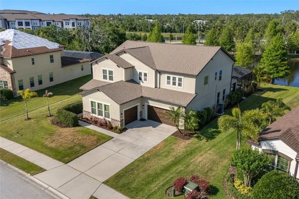 Welcome to Serenity Creek, where timeless style and thoughtful upgrades meet in this beautifully enhanced five-bedroom home with no CDD fees. Tucked in a serene setting with tranquil lake views, this spacious residence blends rustic charm with modern convenience, creating an atmosphere of relaxed sophistication. Step inside to find warm wood floors, high ceilings, crown molding, and a striking stone accent wall that set the tone for the home’s organic farmhouse aesthetic. The open-concept great room, combining the living room and gourmet kitchen, features wood ceiling beams and large windows that frame picturesque outdoor scenes. The kitchen is designed to inspire, outfitted with stainless steel appliances—including a brand-new dishwasher—granite countertops, a breakfast bar, reverse osmosis system, eat-in café, and industrial-style lighting. Upstairs, a spacious bonus room, multiple guest bedrooms, and a luxurious master suite provide privacy and comfort. The master bath offers a soaking tub, walk-in shower, dual vanities, and abundant natural light. Recent upgrades include a new roof (2023), AC system (2023), and fresh office flooring, ensuring peace of mind and modern comfort. Technology and entertainment are seamlessly integrated with surround sound installed throughout the home—including both levels and the outdoor space. Step outside and enjoy the Florida lifestyle to its fullest: a stunning saltwater pool and spa were added, offering the ultimate space to relax or entertain by the water’s edge. Dine under the covered porch or unwind beneath the trellis as you take in the peaceful lake backdrop. Additional features include a dedicated laundry room, den, a two-car garage plus a separate one-car garage. Serenity Creek is ideally located in Lakewood Ranch, close to top-rated schools, shopping, dining, I-75, and just a short drive to the Gulf Coast’s award-winning beaches and vibrant arts scene.