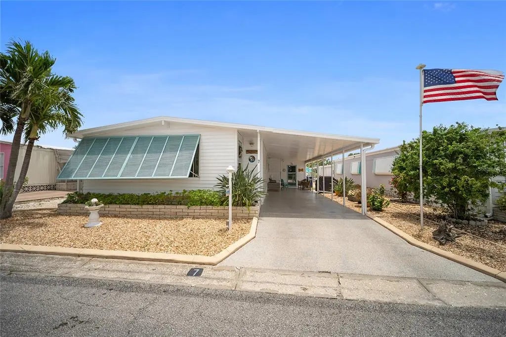 Welcome to the highly sought-after 55+ community of Palma Sola Shores—land-owned, quaint, and perfectly positioned near the water with only 101 homes. This home is charming showcasing Tommy Bahama blue plantation shutters that double easily for storm shutters when needed. Lot 7 is a beautifully updated turnkey residence with a wide-open floor plan that immediately welcomes you with a sense of calm and retreat. No popcorn ceilings here! Inside, you’ll find stylish neutral décor and a bright, modern kitchen renovated in 2021 featuring a spacious island and new appliances. The home offers new flooring throughout, an updated gorgeous walk in shower guest bathroom, a newer water heater (2019), and a well-maintained A/C system (2016). The master suite includes a new sliding glass door with storm panels, opening to a cozy private sitting area to enjoy your morning coffee or afternoon beverages. Additional upgrades include electric blinds in the living room (2023) and a poly-coated driveway (2022). Enjoy multiple areas for relaxing or dining. Another perk is the laundry area attached has a small workshop and storage area. Residents here appreciate the clubhouse, community pool, and private fishing dock, all just a short walk away. Conveniently located near shopping, dining, and only minutes from several stunning beaches. Best of all, this home has had no hurricane or flood damage. The low monthly HOA of just $275 includes cable, internet, sewer, water, and trash—offering true peace of mind and exceptional value.