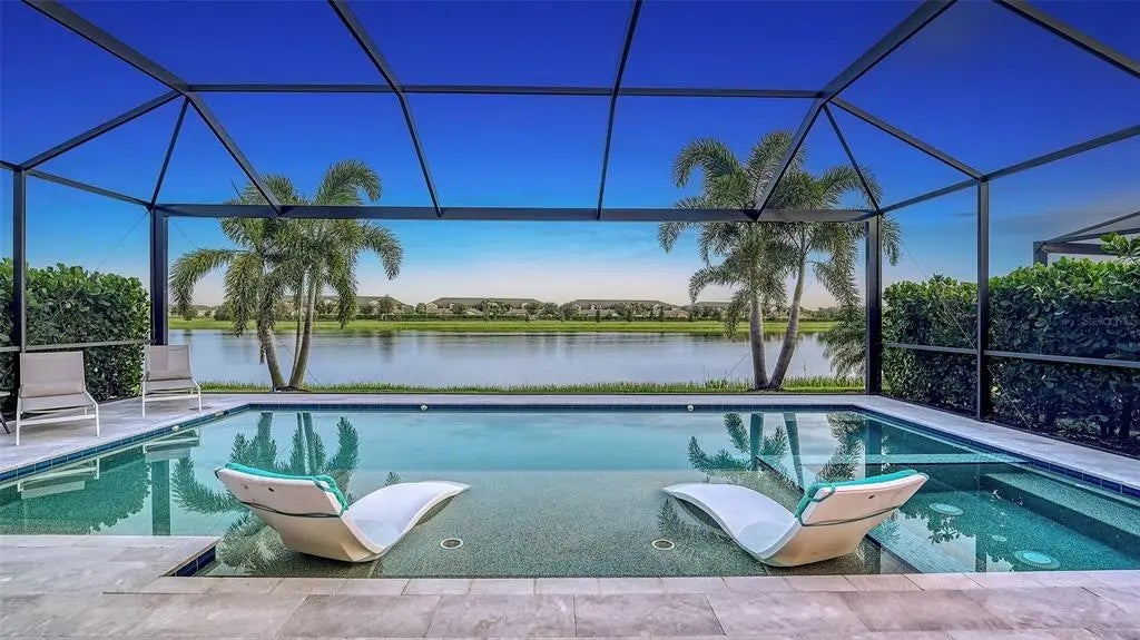 Experience the ultimate blend of luxury, comfort, and resort-style living at 17604 Hickok Belt Loop a Fully GOLF DEEDED home in the prestigious Lakewood National Golf Club. This Stunning Angelina open floor plan home offers everything today’s discerning buyers desire, from breathtaking lake views to an array of exceptional amenities. Upon entry, the expansive water views draw you through the elegantly designed living space and out to the Travertine Tiled Lanai. This outdoor haven features a grand rectangular Pool with Sun Shelf & Spa, perfect for relaxation, while the panoramic screen and swaying palms provide a serene backdrop. The lanai is crafted for effortless indoor-outdoor living, complete with a wood-paneled ceiling and a fully equipped outdoor kitchen, making it ideal for entertaining or unwinding in style. Inside, the home exudes casual elegance with a pale-toned gourmet kitchen that boasts a cooktop, wall ovens, extensive counter space, an island sink, and a convenient pass-through to the outdoor kitchen. Architectural details such as beamed ceilings and wainscoting enhance the warm, inviting atmosphere, blending sophistication with functionality. Full Block construction, Cement Tile roofing and Impact Glass windows throughout, ensures this home is ready for any Florida storms. Situated on a generous 7,998 square foot lot, this residence is a gateway to a lifestyle akin to living in a luxury resort. As a resident, you have membership access to 36 holes of Arnold Palmer-designed golf courses, two on-site restaurants, and two bars. The community offers a wealth of amenities, including a state-of-the-art fitness center, spa/salon, lighted Har-Tru tennis courts, pickleball, bocce ball, and resort-style pools. The grand dining clubhouse and tiki bar provide perfect spots for socializing and dining. This home is not just a place to live; it’s an invitation to embrace a lifestyle of unparalleled luxury and convenience in a vibrant full resort-style golf course community.