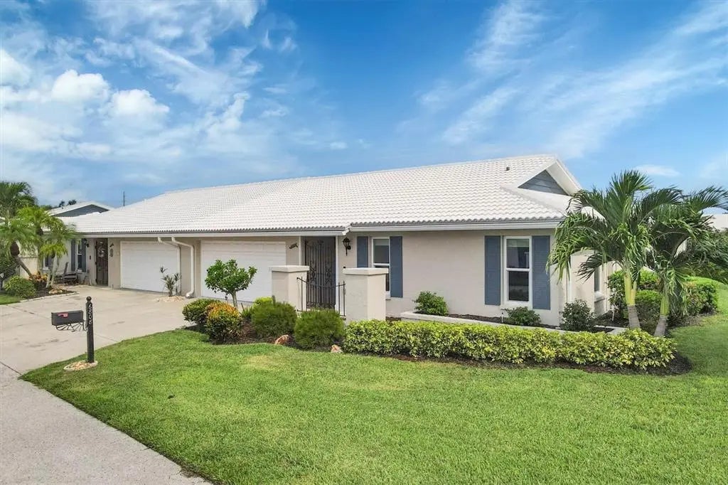 Embrace the Florida lifestyle with this ever-popular 55+ Village Green paired villa on a quiet cul-de-sac and located in far west Bradenton only 5.7 miles to beautiful Holmes Beach on Anna Maria Island. This most popular D model floor plan offers 1803 sq ft of air-conditioned space and includes an exterior 16 x 14 screened paver deck area overlooking a greenbelt, suitable for relaxation and entertaining. This outdoor patio area is referred to as “the bird cage.” This floor plan comes with an oversized 2 car garage with a wind resistant door on remote. As a bonus, tile roof replaced in 2018, A/C and electric service panel new in 2022, all at the owner's expense. For safety reasons hurricane impact wind resistant insulated windows protect the interior. Upon entry, the unit features a secure steel gate and a roll-down hurricane shutter. A ceramic tiled foyer with two large closets, new carpet in the bedrooms, dining room and living room all having crown molding and upgraded window treatments. Double pane insulated French doors open to the Florida room and also access the outside birdcage from the family room. The galley kitchen features a serving pass through to the dining room, granite counter tops, a stainless-steel double sink, refaced cabinets with draw and pantry pull outs, recessed lighting, a new garbage disposal 2022 and a new dishwasher at the end of 2024. Both bedrooms are spacious and include large closets. The primary bedroom suite offers a spacious walk-in shower. Both bathrooms partially updated. The laundry room includes a full-size washer and dryer, a utility sink, overhead cabinets for storage, and extra space that can be used for additional appliances or repurposed as a craft area or office. The land owned condo fee only $350 a month and paid $1,050 quarterly covers basic cable TV, internet, exterior painting, annual roof cleaning, common area taxes, community pool, escrow reserves, grounds maintenance, landscaping (excluding the patio area behind the front pillars), exterior pest control, and pool upkeep. This location provides quick access to shopping centers, medical facilities, unlimited restaurants, GT Bray Park, Robinsons Preserve, Downtown Riverwalk, and the Gulf Beaches. The nearest airports are SRQ, TPA and PIE. For your own personal private showing secure your appointment with the listing agent today.