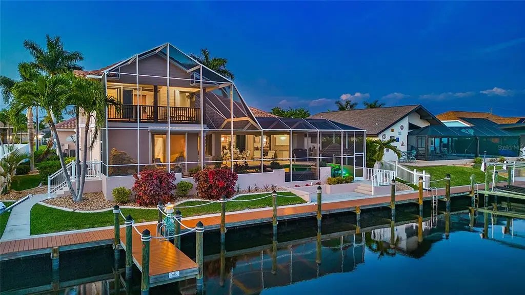 Experience luxury waterfront living with this impressive 4-bedroom, 4-bathroom, 2-story canal front home located in the heart of Cape Coral! Boasting direct Gulf access and nestled on a tranquil canal, this residence offers a peaceful retreat in a prime location. The oversized 2-car garage features epoxy floors, a door to the backyard, and plenty of overhead storage. Step inside to discover vaulted ceilings that create an airyand spacious atmosphere, complemented by an elegant gas fireplace and built-in features that add charm and functionality to the living spaces. The kitchen is the heart of the home and showcases maple cabinetry, corian countertops, an expansive central island, and butler's pantry. The screened-in lanai invites relaxation and outdoor enjoyment, featuring a stamped concrete patio, outdoor kitchen with sink, mini fridge, and jenn air electric grill, all overlooking the canal—a perfect setting for entertaining guests or simply unwinding in paradise. Also on the lanai is a jacuzzi with rock waterfall and small river with swim up bar top. The pool is self cleaning, auto leveling for water, with changing light colors. The open floor plan seamlessly connects the living areas, kitchen, and dining spaces, making it ideal for modern living and gatherings. Upstairs you will find a game room with a pool table, entertainment center, TV, and top of the line sound system. Exquisite details are found throughout this home, including 17" tile flooring throughout, pocket slider doors onto the lanai and upstairs balcony, surround sound system, and main bedroom doorway sensors that automatically turn on lights as you walk through. This waterfront oasis provides not only a luxurious lifestyle but also the convenience of boating access to the Gulf of Mexico. Imagine starting your day with a sunrise cruise or ending it with a sunset sail—all from your private finger dock, extending 15 ft for mooring boats, complete with boat davit and Tiki hut. The seawall was built in 2018, providing peace of mind for years to come. Don't miss the opportunity to own this stunning canal front home in Cape Coral, where every day brings the beauty of waterfront living to your doorstep!