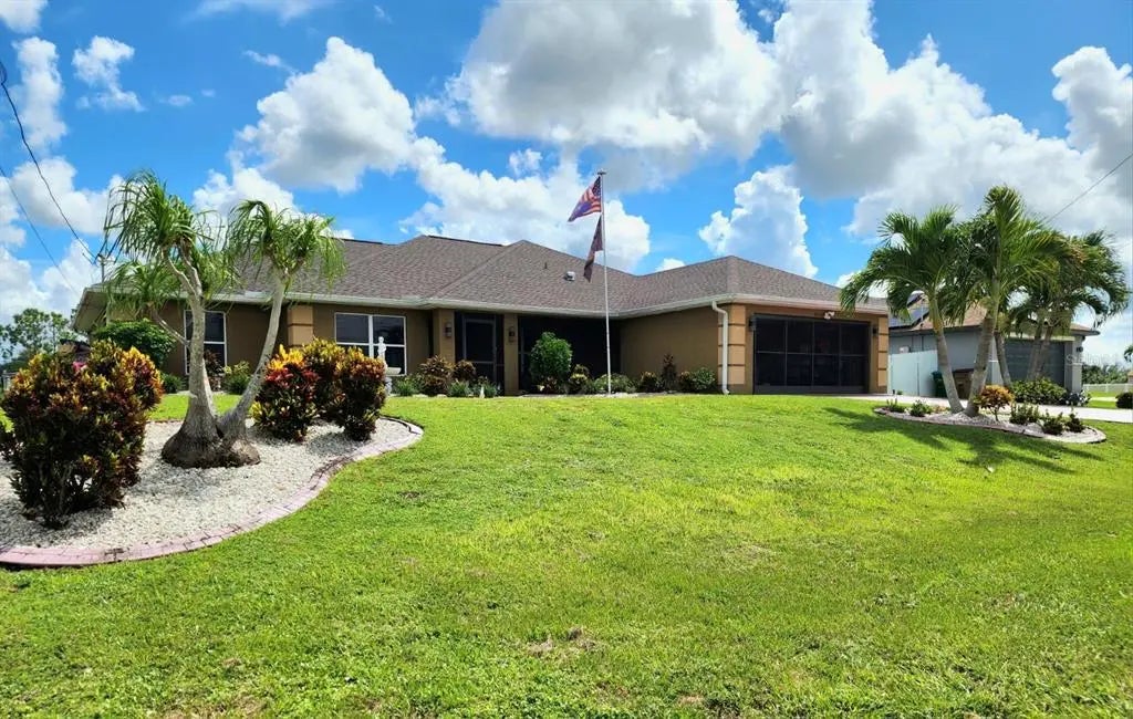No flood zone! 2023 roof! New kitchen! This is a very spacious 4-bedroom + Den, 2-bathroom home located in Cape Coral. With over 2,246 square feet of living space, this 2006-built single-family home offers a functional layout perfect for both relaxation and entertainment. The kitchen features a large pantry and opens to the eat-in dining area, creating an inviting space for gatherings. The den provides a versatile area for a home office or flex room. The primary suite has a large walk-in closet, dual sinks, and a separate tub and shower. Vaulted ceilings, French doors, and built-in cabinets add elegance to the interior design. The home is equipped with central electric heating and cooling for year-round comfort, as well as a screened lanai and fenced patio area, perfect for enjoying the beautiful Florida weather. Additional features include laminate and tile flooring, a laundry room with a tub, and a 2-car garage. The property is situated on a 0.23-acre lot with room for future enhancements. Conveniently located near local schools, shopping, and dining, this home offers easy living in a quiet Cape Coral neighborhood. Don't miss out on this opportunity to own a beautifully designed home with plenty of space to grow!