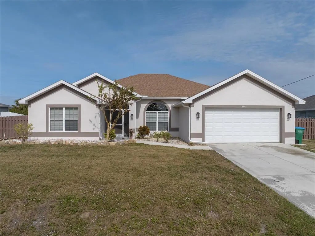 Welcome to this stunning 4-bedroom, 2-bathroom single-family home, offering an impressive 2,324 sq ft of thoughtfully designed living space. Nestled in a quiet Northwest Cape Coral neighborhood, this home combines style, functionality, and comfort — an ideal sanctuary for families seeking both tranquility and convenience. As you step through the screened front porch, you're greeted by a welcoming entryway that opens into an inviting living space. The tile flooring throughout not only adds a seamless flow but also ensures easy maintenance for busy households. The home has been recently painted inside, giving it a fresh, modern feel. The spacious kitchen serves as the heart of the home, featuring brand-new countertops, gleaming stainless steel appliances, and ample cabinet space. Whether you're preparing a gourmet meal or a quick snack, you'll appreciate the functional layout and timeless finishes. The adjacent dining area overlooks the backyard, creating the perfect space for family gatherings. There is also a formal dining room for family and friends to enjoy meals together. Both bathrooms have been recently renovated, showcasing modern fixtures, elegant tile work, and thoughtful design that adds a touch of luxury to your daily routine. The spacious primary suite offers ample natural light, plenty of room for a king-sized bed, and a large walk-in closet. The ensuite bathroom provides a private retreat with updated finishes and thoughtful details including your very own soaker tub for relaxing. Outside, you'll find an expansive fenced backyard that serves as your personal outdoor oasis. The yard includes a cozy fire pit, perfect for starlit evenings, and a large under cover screened lanai, offering shade and protection from the elements. Whether you're hosting weekend barbecues, enjoying your morning coffee, or relaxing after a long day, this outdoor space is truly an extension of the home. The screened front porch adds even more versatile outdoor space, ideal for welcoming guests. This home is not just about aesthetics — it’s also about peace of mind. With a new roof (2021), AC system (2021), and a new water system (2024), the big-ticket items have already been taken care of, ensuring worry-free ownership for years to come. Located just minutes from top-rated schools, shopping centers, and local dining, this property perfectly balances convenience with a peaceful suburban setting. The neighborhood’s quiet streets and friendly atmosphere make it an excellent place to call home. Whether you're raising a family, working from home, or simply looking for a spacious seasonal retreat to enjoy Florida living, this home offers it all. Don’t miss your chance to experience everything this incredible property presents and take the first step toward calling this beautiful home your own!