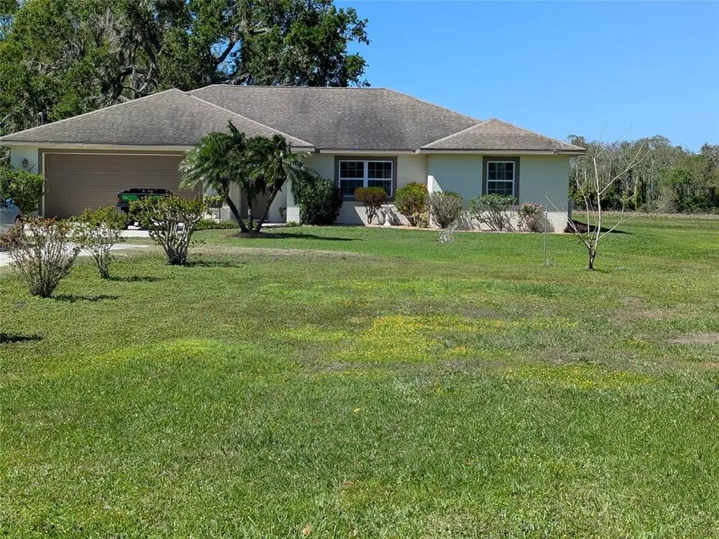 What a great find this is !! Custom built home in 2008 with 3 bedrooms and 2 full bathrooms AND SITTING ON 5 ACRES!. This home has nice large living room that flows into a spacious dining area that in turn flows into the open galley type kitchen that includes a dishwasher and nearly new new stove and refrigerator. The bedrooms are a split plan giving your Primary Owners Suite a lot of privacy with a private bath, walk in closet and a door access to the rear Florida room. The two guest rooms have their own hallway full bathroom. All of this is under Central Air and Heat for your year round comfort. The laundry area, with washer and dryer hook ups , is located in the 2 car attached garage. The house has all newer flooring described as "vinyl plank" and has a hardwood look. The 3 bedrooms all have carpet. The original house plan featured a rear screened lanai. Seller has upgraded Lanai with the new flooring as well as windows. Seems to merit the title of "Florida" or "Sun" room since its definitely where you can sit and relax and have your morning coffee while overlooking all your land and any potential wildlife, all in complete comfort. In the back yard, you will find sheds for all your storage needs as well as the carport which can accommodate multiple usages. This five acres is already fenced on two sides and across the back. Seller has added a chain link fenced area on the south side of the house , perfect for household pets to enjoy the outdoors safely. Make your appointment to view all of this as it does require a 24 hr. lead. Sellers disclosure is attached to listing.
