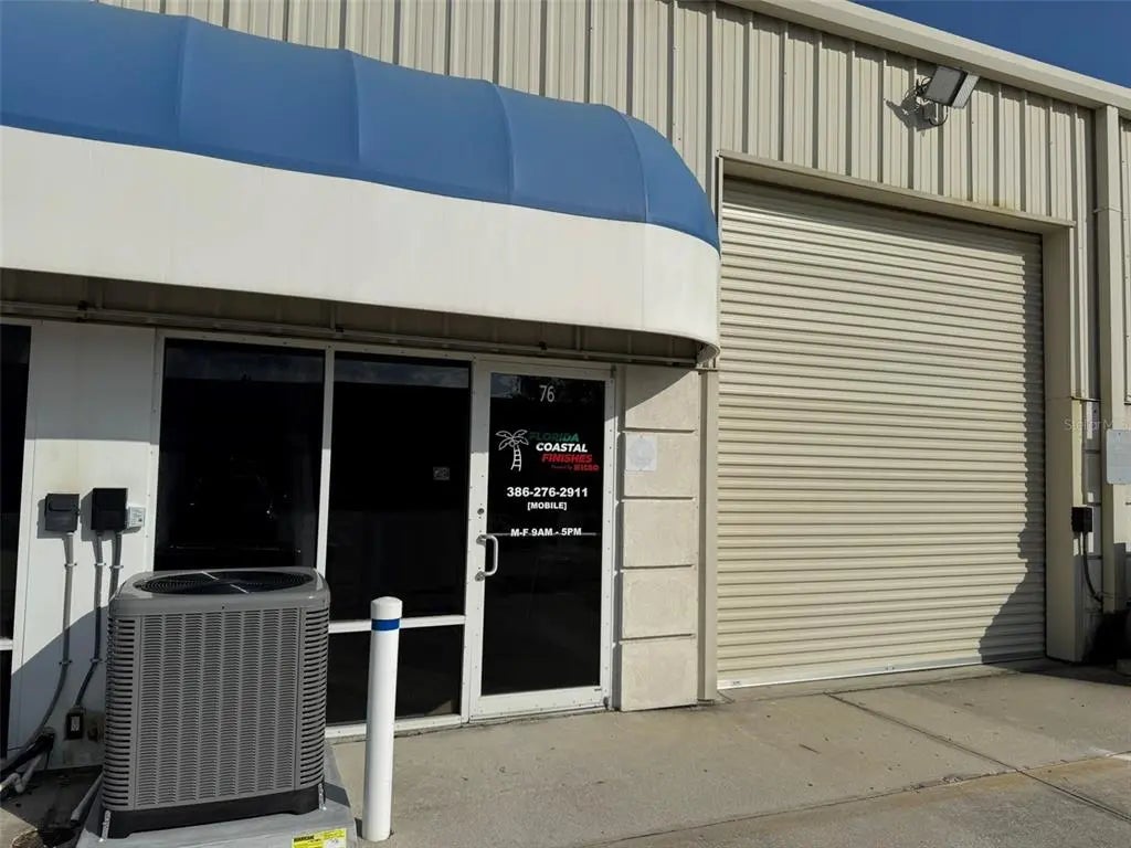 Industrial condominium unit 76 with glass front, glass entry door and 10’ wide x 12’ high roll-up door. 1000 SF unit with 200SF office and 800 SF warehouse along with second-floor 400 SF mezzanine office area. The unit features high ceilings, ADA restroom and full air conditioning. Centrally located in Flagler County. Minutes to SR 100 and Palm Coast Pkwy via US-1. Excellent location for office, retail, building trades, showroom, etc. Automotive services not permitted under condominium rules. Tenant responsible for sales tax, interior maintenance, utilities, and HVAC maintenance contract. HVAC system replaced in February 2025.