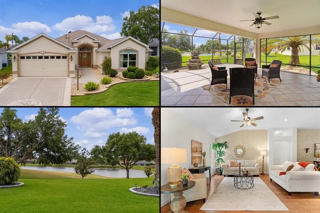 Experience stunning GOLF COURSE and WATER VIEWS without the hefty price tag of a golf front lot!! This expanded, custom Live Oak/Lantana Designer Home overlooks picturesque Amberwood 8th hole. Quiet cul-de-sac location, surrounded by friendly, welcoming neighbors, in the pretty, well-established Village of Chatham. BOND PAID!! Elegant custom drive and walkway lead you to a beautiful front entry door with transom and side light windows. Inside you'll discover a well-designed interior with Corian countertops, marble window sills, bullnose (rounded) corners and knockdown finish on walls and ceilings. NO CARPET! NO POPCORN ceilings! Beautiful custom tilework and wood flooring throughout. Use the extra square footage in the addition just off the kitchen dinette for a home office or a bar/entertaining area. The primary suite is spacious enough for a sitting area. Ensuite bath offers dual sinks and a tiled walk-in shower with bench and safety bar. Guest quarters include two bedrooms and one bathroom. The front guest room features a beautiful window that bathes the space in natural light, while the adjacent bedroom has two closets for ample storage space. The guest bath offers a convenient shower-tub combo. The garage is stretched to 30 ft depth. It has a workbench, epoxy-coated floor, pull-down aluminum attic stairs, and an attic fan. Additional highlights include 2020 roof, 2018 TRANE HVAC with APRILAIRE filter, and a 2021 hot water heater. Step into the lanai and birdcage to relax and enjoy the wonderfully tranquil water and golf views. With room for a pool, this home offers comfort, luxury, and functionality. Don't miss the opportunity to own this outstanding home at a terrific price! Schedule your private showing today and experience the epitome of Florida living! Conveniently located close to Publix, shopping, restaurants, and all the essentials. This well priced, well maintained home is just waiting for your own updates and personal style!