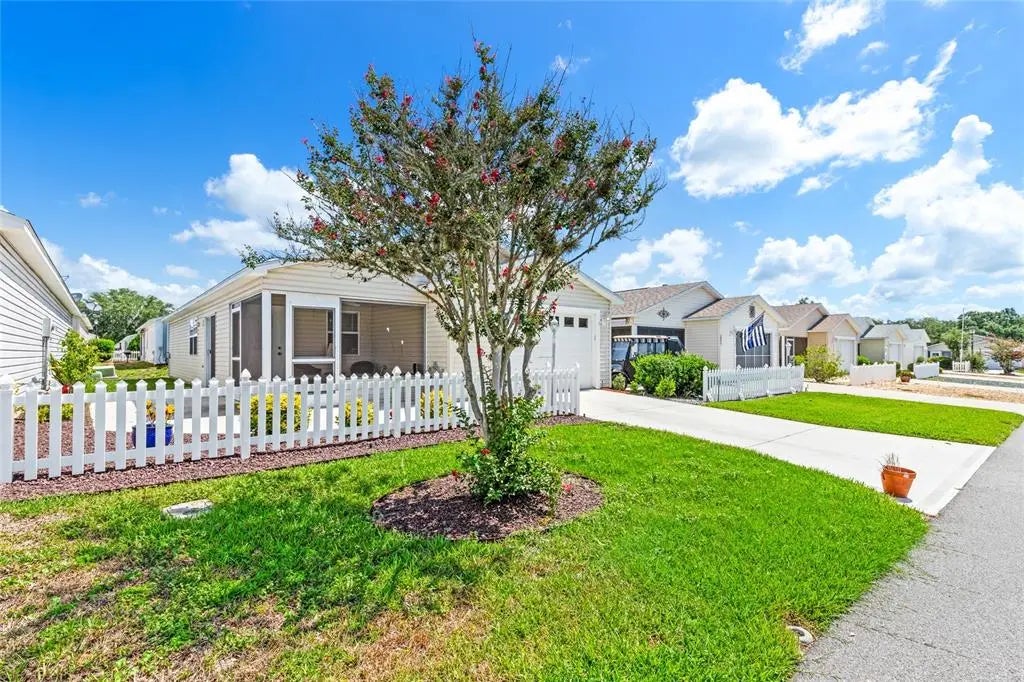 Welcome to this delightful 2-bedroom, 2-bath Cabot Cove villa nestled in the sought-after Village of Santiago. With turnkey convenience, this home invites you to experience Florida living at its finest. The interior boasts luxury vinyl plank (LVP) flooring, modern light fixtures, and a fresh, popcorn-free ceiling.Home has a newly painted driveway. Plus, the roof was replaced in 2019 for added peace of mind. NO BOND means no additional costs. Enjoy the convenience of a garage for one car and one golf cart. The villa also features new landscaping and an irrigation system. This home is in close proximity to the Savannah Center, Nancy Lopez Country Club and Glenview Country Club. A convenient location between Spanish Springs and Lake Sumter Landing where you will find nightly entertainment and and varitety of restaurants. Negotiable golf cart included! Don’t miss out—schedule your showing today and make this villa yours!