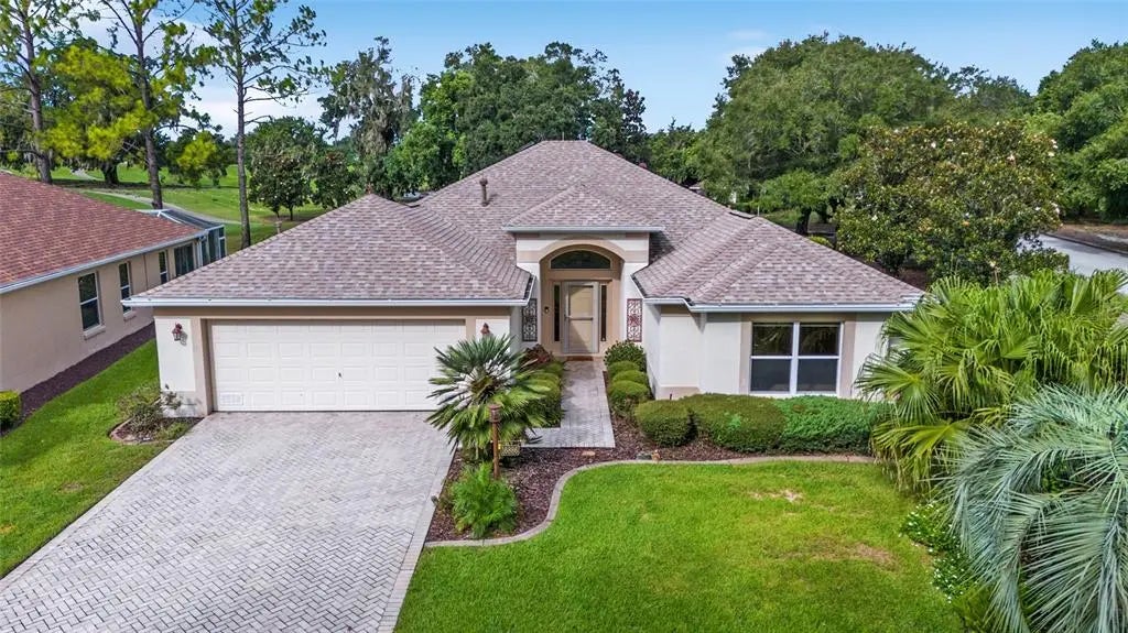 Amazing price drop for this beautiful view! Are you ready for a 180 degree double fairway view? Welcome to the 7th tee box of Torri Pines, one of the three courses that compose the Lopez Legacy championship courses. Looking out the front door, you have a beautiful view of the pond and green of the 6th hole. This corner lot in Calumet Grove is beautifully landscaped and has a brick driveway to enhance this serene block and stucco home. All of the major expenses have been taken care of for you. The BOND IS PAID, the ROOF was replaced in 2021, the HVAC in 2018, and the HOT WATER HEATER in 2017. The whole house water filtration system is also an added bonus. The extra wide garage has a painted floor and storage galore. Along with the free standing cabinets, you also have a closet. There is an air circulation system in the garage, double insulation and an attic fan to help the energy efficiency of the home. Walking into the front door you will find a rare feature, an extra large hall closet. The entire home is graced with a neutral pallet which enables you to put your own personality into your new home. The Granite Transformation countertops and upgraded stainless steel appliances are ready for your pops of colors. Updated stainless steel appliances sparkle in the kitchen. Newer washer and dryer are part of the large laundry room where you will find space to add storage or an office. This Lantana is a spacious 3 bed 2 bath home. You can watch the bluebirds raise their family in the backyard while you relax on the enclosed lanai or sit under the pergola. This home is located near Mulberry Shopping center, with The First Responders recreation center in the same neighborhood. Come enjoy the active community of Calumet Grove. While tucked away in the north end of The Villages, there is easy access in and out to whatever your destination may be. Route 42, 301, 441/27 are just around the corner. Termite bond through July 2025. Buyer concessions possible if presented with contract.