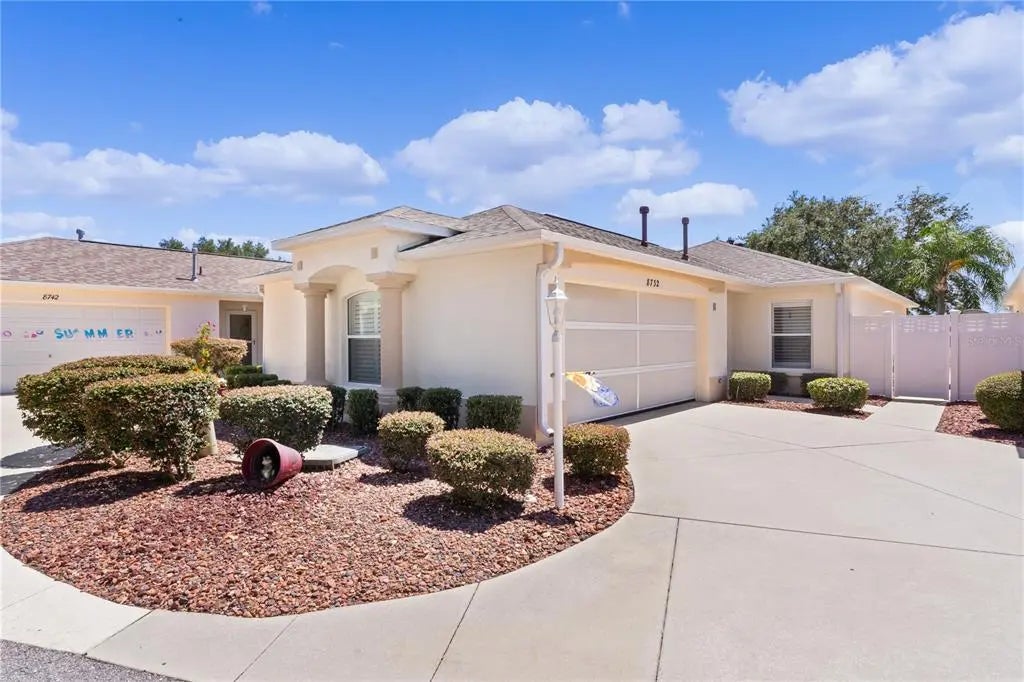 OUTSTANDING ! Welcome to this TURNKEY Courtyard Villa you’ve been dreaming of! This custom Beauregard Block & Stucco home is a showcase of elegance and comfort. The KITCHEN is a culinary delight, featuring Corian countertops with a unique two-level design, top-of-the-line natural gas stainless steel stove and appliances, diagonal tiled flooring, and a knockdown ceiling texture. The spacious pantry, large stainless steel sink, and soft-closing drawers and cupboards add both style and functionality. The living area is equally impressive, with high-end laminate flooring and soaring volume ceilings. Modern ceiling fans with REMOTE CONTROLS and plantation shutters throughout enhance the ambiance, while the enclosed, air-conditioned lanai provides a perfect retreat. Step outside to the expansive 15' x 28' birdcage, where you’ll find a convenient hot tub with an easy-move cover and year round FLORIDA furniture . This TURNKEY home includes all furniture, household goods, decorations, linens, and more—everything you need to move in and start enjoying. Both the primary and second bedrooms come with queen-sized beds and laminate flooring, complemented by FULLY EQUIPPED bathrooms with showers. Over the past two years, the entire home has been professionally decorated and furnished to perfection. The rare TWO-CAR GARAGE features remote-controlled, high-end SCREENED AND SOLID doors. It also comes with a 2015 Yamaha gas GOLF CART, complete with a desirable sliding door enclosure. Located on the Nancy Lopez Championship Golf Course, this home offers stunning views, exceptional privacy, and low-maintenance landscaping. Nearby recreation, shopping, the VA Center and more are easily accessible via golf cart. With its many convenient features, NO BOND, this property is an outstanding value at $449,000. Don’t miss this opportunity to make it yours!