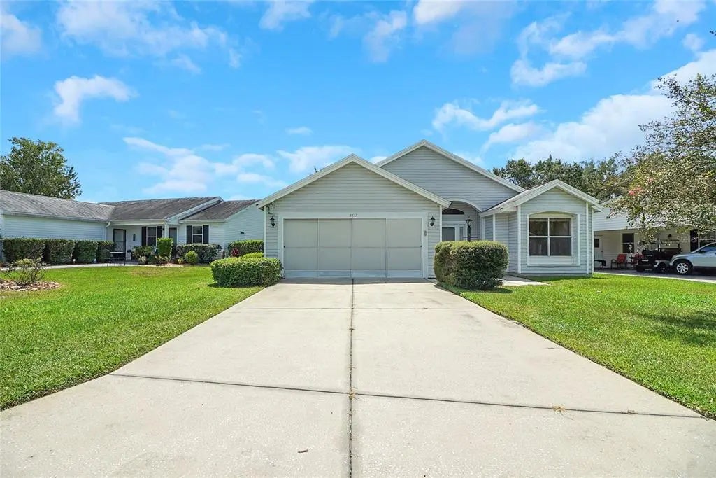 Quaint 2/2/2 single family residence with NEW ROOF BEFORE CLOSING in The Villages with No Bond! This split and open floor plan welcomes you with a very large entryway housing the guest bedroom and bathroom, door to the garage and a coat closet. This home features laminate flooring throughout and ceramic tile in the wet areas, ceiling fans, washer and dryer in the garage and high ceilings. The spacious kitchen offers plenty of counter space, a pantry cabinet, a dinette area and a peninsula. There are plenty of windows in this home keeping it light and bright. The master suite has a very large walk-in closet, and a walk-in shower. There is also a nice sized enclosed Florida Room with a wall unit and ceiling fan and an outdoor patio area fit for a table and BBQ. There will be a new roof installed prior to closing, the HVAC is 2015 and HWH is 2010. This location is excellent! It is minutes by golf cart to Spanish Springs Square offering nightly entertainment, restaurants and shopping, close to the hospital, medical offices and so much more. Enjoy all of the amenities The Villages has to offer while living your best life.