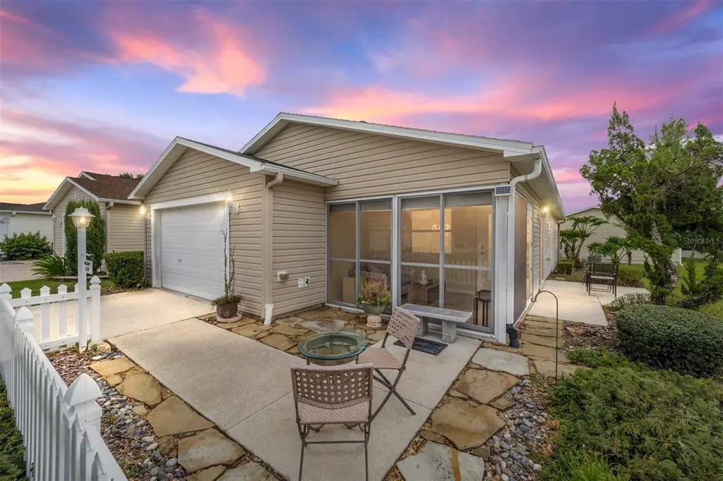 Village of Belvedere – Arlington Villas – Colony Patio Villa with VAUTED Ceilings on a CORNER LOT!! – Villa comes FURNISHED/TURNKEY!! -- Roof 2019! -- HVAC 2017!! -- Gas Water Heater 2015!! -- ENCLOSED Front Lanai with Stone Walkway, Side-Entry to Home, Side Patio with Slider Door Entry to Living Area, Gutters & Downspouts and Irrigation System -- Enclosed Lanai with Vaulted Ceiling, Tile Flooring and Ceiling Fan -- NO CARPET in this Villa!! -- Tile & Laminate Flooring -- Open Floor Plan with Foyer Entry leading you thru the Dining Room to the Living Room and Kitchen -- UPGRADED LIGHTING in this home – So Unique!! – Kitchen with Pendent Lighting, GRANITE-Topped Breakfast Bar, Ceiling Fan with Light, Closet Pantry, and Shiplap on Breakfast Bar Front -- Shiplap continues down the Hallway to the Hall Linen Closet! -- Guest Bath with Tub/Shower Combo, and Guest Bedroom with Vaulted ceiling and Ceiling Fan – Primary Bedroom with an EN SUITE BATHROOM!! Walk-in Closet, Window to Side Yard, Vaulted ceiling and ceiling Fan – En Suite Bath with a Vaulted Ceiling, Exhaust fan, Medicine Cabinet, Linen Closet, and “All-in-One” Shower with Rain Showerhead!! -- The Garage is “L-Shaped” and accommodates 1-Car with Golf-Cart Parking, LG Top-Load Washer (11/2023), LG Dryer (11/2023), Utility Sink and Attic Access. **Don’t miss out on this Clean and Well-Maintained Patio Villa in the much-sought-after neighborhood of Arlington Villas (Between 466 & 466A) – close to Shopping & Restaurants, Walmart, Fresh Market, Sprouts, and Banking on 466 – nearby is the Belvedere Library! ** With a quick Golf Cart Ride to 2 Pools, Arnold Palmer restaurant and Country Club, Pimlico, Belmont & Churchill Greens Golf Courses, and to Lake Sumter Landing Market Square ®, The Villages FL!!