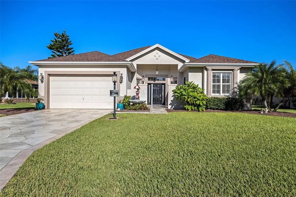 PREMIER HOME, BOND PAID, TURNKEY! Discover the elegance and convenience of this PREMIER Carrera model home in the desirable De La Vista East. All homes on the street are Stucco! Thoughtfully designed for comfort and style, this TURNKEY home has ROOM FOR A GOLF CART GARAGE. As you approach the home, you will love the stamped concrete driveway with lovely landscaping to accent the home. The spacious front courtyard is the perfect place to welcome your guests. The front door has side lites and a transom window allowing natural light to flow into the welcoming foyer. You will be amazed at the 10 ft ceilings that enhance the space of this home. PLANTATION SHUTTERS adorn the windows, adding a touch of elegance. The living room provides the perfect space to gather or entertain and flows seamlessly to the FLORIDA ROOM with backyard views and lovely landscaping. If PRIVACY is what you are looking for, this home has it! This home backs up to a privacy wall. With county approval, a POOL can be added to the right side of the house by adding a door through the dining room. The kitchen has white cabinets with pull-outs, GRANITE countertops, dual pantries, stainless steel appliances, and an island with drawers for extra storage. For more casual dining, the breakfast nook sits just off the kitchen. The dining room is complete with a wet bar, perfect for entertainment! The primary suite has sliding glass doors that lead to the Florida room and a large walk-in closet. The ensuite bathroom has a ROMAN SHOWER and a dual sink vanity with GRANITE countertops. The cozy front bedroom is the only carpeted room with direct access to a hall bath, making it a possibility to be a 2nd primary suite! The hall bath has a walk-in shower with glass doors, GRANITE countertops, and plenty of space for your guests. A charming Murphy bed has been added to the second guest bedroom, complete with a closet, offering flexibility for guests. Other updates include Roof 2019 and HVAC 2015, ensuring peace of mind for years to come. The Village of De La Vista East is ideally situated ONLY about 1.3 miles to LAKE SUMTER LANDING and about 2.1 miles to SPANISH SPRINGS. Close by are Tierra Del Sol Country Club and Championship Golf Course, Hacienda Regional Recreation Center, Mira Mesa Executive Golf Course, The Villages Regional Hospital, and various shopping and dining options along 441 and 466. This home is truly move-in ready and ideal for anyone looking to embrace a carefree lifestyle! Call today to make this your next home!