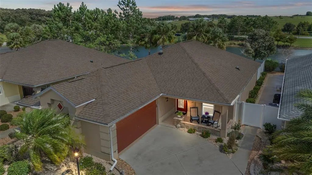 Discover this stunning WATERFRONT Arlington courtyard villa with full TWO-CAR GARAGE, glass-enclosed lanai, and large birdcage, nestled in the highly desirable Villages of Pine Ridge! Enjoy sweeping water views from the comfort of your home. With the BOND PAID, this beautifully appointed 3-bedroom, 2-bathroom residence blends elegance and convenience, making it ideal for both relaxation and entertaining. As you approach the home, you'll be greeted by beautiful landscaping and a charming front porch featuring a knee wall, ceramic tile flooring, and a new glass front door with side lights. Step inside to find a spacious living room adorned with vaulted ceilings, CROWN molding, and gleaming engineered HARDWOOD floors. Glass sliding doors lead to a serene glass-enclosed lanai, seamlessly merging indoor and outdoor living spaces. The elegant dining room mirrors the same impressive features, creating an inviting atmosphere for gatherings. The chef's dream kitchen showcases tile flooring, luxurious QUARTZ countertops, white cabinetry, and newer LG stainless steel appliances, large breakfast bar, a large solar light, under-cabinet lighting, and a stylish mirror-tile backsplash. Retreat to the primary bedroom, where vaulted ceilings and hardwood flooring create an airy ambiance. Enjoy sliding doors that open to the glass enclosed lanai, a spacious walk-in closet with custom cabinets, and a stunning en-suite bathroom featuring a walk-in shower, double sinks, quartz countertops, a linen closet, and solar lights. Two additional bedrooms feature TRAY ceilings and hardwood floors, with one offering a convenient Murphy bed and built-in desk. The additional bathroom is both functional and stylish, featuring a tub/shower with quartz countertops and a solar light. The indoor laundry area includes a utility sink and built-in white wood cabinets for ample storage. The 2-car garage is equipped with built-in cabinets, epoxy flooring, and a dedicated work area for all your projects. Unwind on the rear screened birdcage, where tranquil water views await. Additional highlights include an insulated garage door, Omni Shield, new ceiling fans in the living room and primary bedroom, pleated shades in living room and primary bedroom, and solar tubes with night lights in the kitchen, primary bathroom, and guest bathroom. Enjoy the elegance of PLANTATION SHUTTERS throughout, shades in the glass enclosed lanai, along with newly updated light fixtures in the kitchen, dining area, and entry and no carpet throughout the home. Furniture is available separately (some exclusions may apply). Don’t miss the opportunity to make this exquisite waterfront home yours! The village of Pine Ridge is conveniently located between Brownwood Paddock Square and Lake Sumter Landing; Close to Belle Glade Country Club and Championship Golf Course, Moyer Pool and Recreation Center, Colony Cottage Regional Recreation Center, Pine Ridge Pool and Mailbox Station, Atlas Dog Park; multiple pools, golf, and pickle ball; and 466 with an abundance of shopping, restaurants, banks, and medical. PLEASE WATCH OUR WALKTHROUGH VIDEO OF THIS BEAUTIFUL HOME and call today to schedule your Private Showing or Virtual Tour!