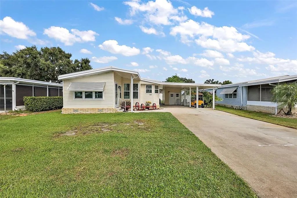 As you enter the Florida Room and its surround of windows you notice the open and airy feel of this extended living area leading to the dining area all enhanced by volume ceilings, upgraded trim, and textured ceiling and wall finishes. The naturally lighted kitchen has been upgraded with granite counters, cabinets, and appliances with plenty of storage and counter space. Passing through the living area you enter the oversized hallway which takes you to the primary suite and bath area with a double sink, changing area, and enclosed commode and step-in shower. The second bedroom immediately across from the guest bath has a full tub and shower, and just across the hall, you find the laundry room with additional cabinet space and storage. Entering the carport from the laundry room you access the oversized carport and driveway where your golf cart stands ready at its charging station. The outside under carport storage room has power and water and could double as a great workshop. To the back of the workshop, you find the well for irrigation, a great savings on your water bill. Over the years this impeccably maintained home has been upgraded to include: underside tie down and plumbing re-pipe, new hot water heater, appliances upgrades, kitchen and bath upgrades, waterproof laminate flooring, new thermal pane windows, Florida Room addition, Termite Bond and lifetime roof warranty on Aluminum overlay. Come and enjoy the Fox Run lifestyle, with its full schedule of social activities centered around its clubhouse, two pools, marina, and boardwalk or just enjoy a day of fishing or cruising with your friends on the "Harris Chain of Lakes." The home is offered furnished including a golf cart for you to immediately enjoy the "Fox Run Lifestyle". Call and schedule your showing today!.