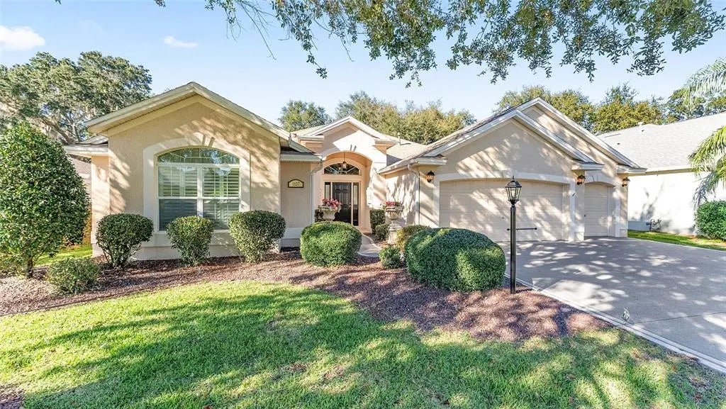 EXCEPTIONAL GOLF FRONT Designer LANTANA, stretched to 2097 SF at original build, PLUS an ADDITIONAL 760 SF of AIR CONDITIONED LIVING SPACE, 2021 ROOF, 2017 AND 2021 AIR CONDITIONING UPGRADES, 2023 HOT WATER HEATER and BOND IS PAID. Nicely landscaped yard surrounds the FRESHLY PAINTED DRIVEWAY AND WALKWAY that leads to the covered entry of this UNIQUE PROPERTY. Enjoy GREAT VIEWS of the HERON GOLF COURSE, LAKE and a myriad of birds, wildlife and golfers. These are best viewed from the EXPANSIVE, ENCLOSED LANAI which has plenty of room and currently includes an additional living room, dining area and SUMMER KITCHEN with grill, wet bar, wine cooler, island bar, additional storage and large flat screen TV. This BONUS ROOM is accessible from the breakfast area, living room and primary bedroom suite. From here, you can access the pool area which offers a HEATED and JETTED SWIM SPA, FLOOR TO CEILING SLIDERS that allow for screen enclosure option or enclosed swimming area when needed. This expanded LANTANA model offers a large LIVING AREA that opens to the DINING AREA, KITCHEN and BREAKFAST AREA. All of these areas have diagonal tile flooring, high ceilings with fans and upgraded lighting. The kitchen offers NEWER STAINLESS APPLIANCES, GAS COOKING, PANTRY CLOSET and direct access to INSIDE LAUNDRY ROOM with full size washer and dryer plus room for storage, office desk area, etc. The ample PRIMARY SUITE includes 2 ceiling fans, ENSUITE BATH with WALK IN SHOWER, double vanities, separate water closet, large WALK IN CLOSET and access to the large enclosed lanai. The GUEST WING has two guest rooms, both with closets, carpet, ceiling fans, plus a guest bath with TUB/SHOWER combo. A SPEAKER SYSTEM provides music in living area, lanai and master suite. SOLAR TUBES provide great natural light in the kitchen, dining area and guest bath. Two car plus golf cart garage, offers substantial space to house your vehicles and still have room for storage. There is a surge protection system in the garage and pull down stairs to attic over garage make it easy to store additional items. Excellent location with multiple community pools, Cane Garden Country Club, multiple executive golf courses, championship golf courses and rec centers nearby. Just 2 miles to so many activities at LAKE SUMTER LANDING, including over a dozen restaurants, many retailers including Barnes & Noble, medical offices, 2 urgent care centers, Winn Dixie Grocery store, golf cart gas station and FREE NIGHTLY ENTERTAINMENT on the square. BOND IS PAID! Annual maintenance/fire dept. fee is $542. Monthly amenity fee of $195 provides access to dozens of rec centers, community pools, clubs, pickleball, tennis, golf and more! Located in one of the most desired locations in The Villages, this home offers great living space, beautiful golf and water views and a variety of social and athletic options to start living your best life! Urns on pedestals and Bacchus releifs at front entry do not convey. Wall Sconces that are not hard wired do not convey. All artwork and furniture will be removed before closing.