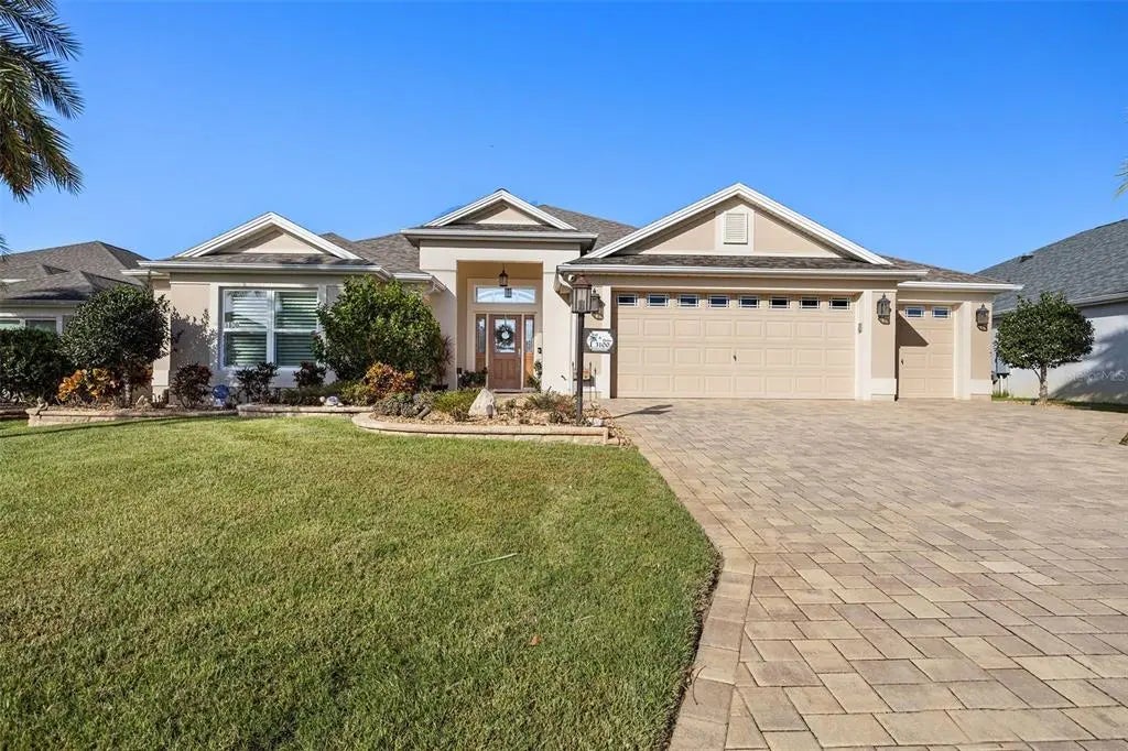 Welcome to this stunning block & stucco home located in the village of PINE RIDGE. Lovely curb appeal awaits you, features a paver driveway and thoughtfully designed landscaping. The inviting covered entrance welcomes you with a beautiful half-glass front door, matching sidelights, and a horizon window that fills the entry with natural light. Step into the spacious foyer, where a coat closet provides convenient storage. Throughout the main living areas, 24" diagonal tile creates a clean, open feel, while CROWN MOLDING and PLANTATION SHUTTERS add an elegant touch to the living and dining rooms. Step through the expansive stacked back sliding glass doors leads to an ENCLOSED LANAI with a mini split unit featuring Chattahoochee River Rock, stretching along the entire back of the home. Shrubs have been strategically placed to provide PRIVACY to the lanai. The kitchen boasts white shaker-style cabinetry with under and over-cabinet lighting, pullout shelves, a corner lazy Susan, a built-in double oven, tile backsplash, and stunning GRANITE countertops. A center island provides an efficient workspace, while tasteful pendant lights illuminate the breakfast bar. The cozy breakfast nook offers the perfect spot for casual dining and overlooks the large lanai. The primary suite is a private retreat featuring vaulted ceilings and a luxurious ensuite bathroom with dual sinks, a Roman shower, and a spacious CUSTOM walk-in closet. A large guest bedroom at the front of the home also features a tray ceiling and a double-door closet, while the second guest bedroom offers a vaulted ceiling and ample space with a closet for your guests. The guest bathroom with a tub/shower combo is ideally located for your guest's convenience. The home includes a large interior laundry room with matching cabinetry and a built-in desk. The 2-car garage with a TANDEM GOLF CART GARAGE offers plenty of storage space. Other features include a water softener and transferable termite bond. Located in the desirable Village of Pine Ridge, you’ll be close to Belle Glade Country Club, Sarasota Golf Practice Facility, Colony Plaza, local shopping, dining, recreation centers, and the beautiful Sharon Rose Wiechens Nature Preserve. Call today to schedule a showing and make this home your next home!