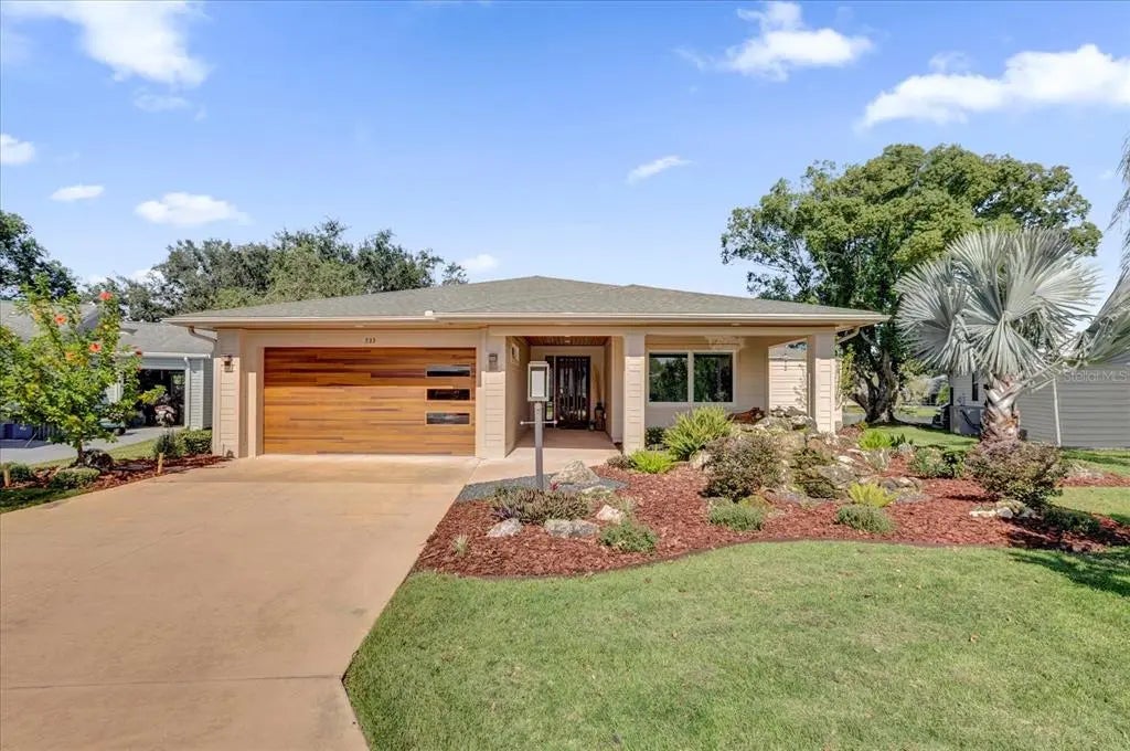 Welcome to your dream home in The Villages. This one-of-a-kind, customized home is a gem. Designed and built by the owner, it is 100% ADA compliant with every area being level and free of any steps. You will be impressed by its unique features, notice the dimensional and textured siding, along with the beautiful courtyard looking up at the ceiling. You'll be greeted by a peaceful water feature with two disappearing waterfalls, one faces the street and one the home. As you enter through the custom-built front door you come to an interior that exudes luxury and functionality. Attention to detail in this home is evident from its custom light fixtures to its 8-foot doors that are 36 inches wide, all countertops are made of quartzite for durability, Cortex LVP flooring for a sleek and modern look and Kohler plumbing fixtures. The heart of this home is its great room with a gas propane fireplace featuring tile to the ceiling. Built-in cabinets with floating shelves add style and function to this room. What will catch your attention are the 10 glass doors to the lanai and 15 windows overlooking a serene pond complete with your private dock. The primary suite is luxurious with barn doors leading to your lanai with stunning views, and an oversized custom walk-in closet. The en suites have porcelain tile floors and walls, and four body sprayers for ultimate relaxation. But there's more, a European Valero full-length body dryer! Enjoy your private garden through a window with a unique curtain waterfall. The vanity area overlooks the pond. Custom cabinets feature double sinks and plenty of storage. The oversized water closet includes a built-in vanity and transom window for natural light. The kitchen is top-of-the-line with Electrolux double ovens, Bosch Elite five-burner cooktop with fingertip slide controls and touch technology Delta faucet. Custom cabinets add style and functionality, making it a chef's dream. The pantry has 15 shelves and 12 wire baskets on drawer glides, and a sensor that turns on the light when you enter. A unique utility room that makes laundry a breeze. Equipped with sink, clothes hanging bar, two folding areas and ample storage space with multiple cabinets and drawers. Spacious guest bedroom complete with closet organizer, transom window and a smart TV. The guest bath is equally impressive with its spacious shower. Need extra space for work or hobbies? Look no further than the office/third bedroom which features a large window overlooking the beautiful waterfall garden and built-in organized closet. The oversized garage features an easy access cement ramp leading into the utility room, utility sink, gas tankless water re-circulating system for instant hot water, a carbon filtration system for pure drinking water, water softener to protect your appliances from hard water damage and even a built-in vacuum system with five floor sweeps. Don't let power outages ruin your day. This home is equipped with a 24-kilowatt whole-house generator. Practical upgrades like Raptor Gutter Guards on all gutters means less maintenance for you. Outdoor enthusiasts will love the multiple outdoor hose outlets strategically placed around the house along with landscape lighting to showcase its beauty at night, ideal for evening gatherings. This is a must-see home. The description doesn't even begin to do justice to its amazing features. Don't miss the opportunity to call this your forever home and schedule a viewing today!