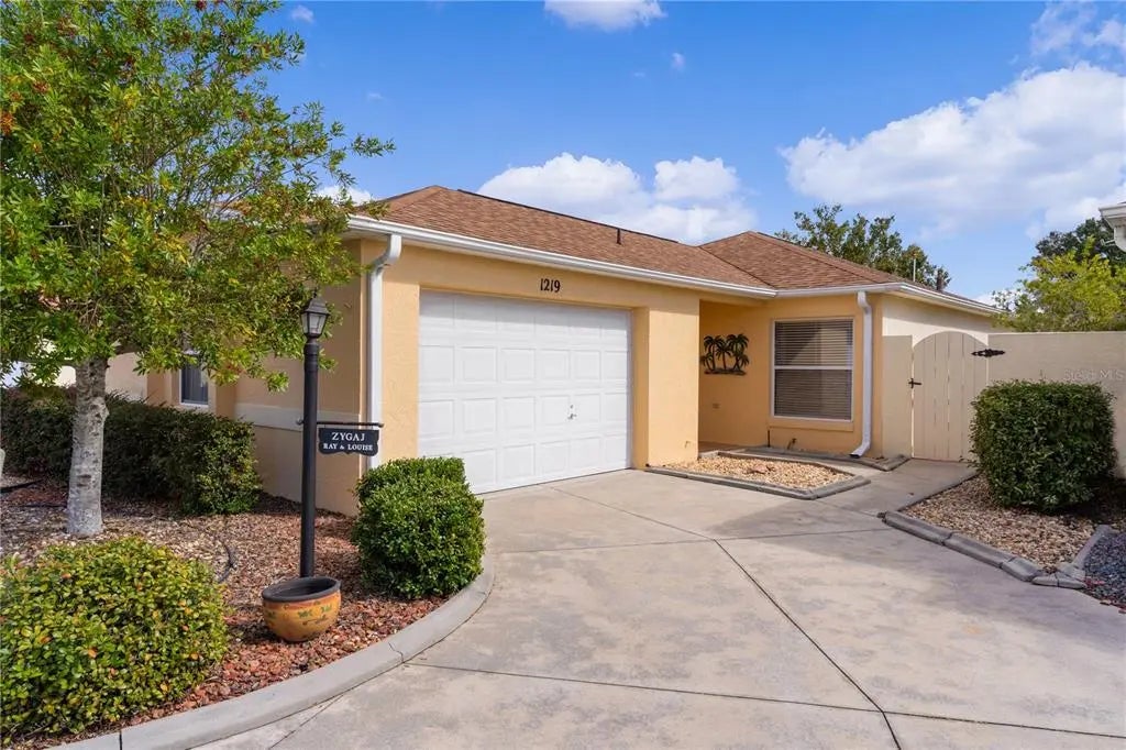 BOND PAID! TURNKEY! Charming stucco courtyard villa in the desirable Village of Santiago's San Leandro Villas. Featuring a NEWER ROOF (2020) and lovely curb appeal with lush shrubs and low-maintenance rock landscaping. Enter through the front door with a sliding screen into a welcoming, tiled foyer. The kitchen boasts tile flooring, elegant GRANITE countertops and backsplash, a breakfast bar, and a convenient closet pantry. The open-concept dining and living area showcases beautiful ENGINEERED HARDWOOD FLOORING. Sliding glass doors in the dining area lead to a side patio, perfect for grilling or creating an additional seating space. The spacious living room opens to a bright FLORIDA ROOM, ideal for entertaining or simply relaxing. Step out to the large screened-in birdcage with painted concrete flooring, where you can enjoy Florida's sunshine and fresh air. If PRIVACY is what you are looking for, this home has no rear neighbors! The primary suite comfortably fits a king-size bed and includes a walk-in closet with ample shelving. The en-suite bathroom features a walk-in shower and GRANITE countertops. A pocket door separates the guest area, allowing your guests privacy. The guest bedroom offers double-door closets and a welcoming space for visitors. The guest bathroom includes GRANITE countertops, a shower/tub combo, and a nearby linen closet for convenience. The garage accommodates a car and a golf cart and includes a utility sink and extra shelving for storage. Located just 10 minutes from Spanish Springs and Hwy 441, this villa is close to a variety of shopping, medical facilities, restaurants, and more. Lake Sumter is also about 10 minutes away, and the community pool within Santiago ensures easy access to leisure activities. Call today to see why this villa should be your next home!