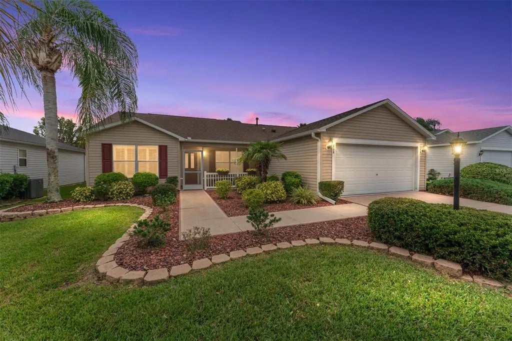 Imagine yourself living in this UPGRADED & MOVE-IN READY, AMARILLO Ranch home with 3 BR/ 2 BA/2 Car Garage, perfect for enjoying the unmatched VILLAGES LIFESTYLE in sunny central Florida! This hidden gem is perfectly situated in a PRIME LOCATION between CR 466 & CR 466A and just 8 minutes from Lake Sumter Landing town square! Nestled on a quiet CUL-DE-SAC street, this home has so much to offer - lower Sumter County taxes, easy access to the Buena Vista Blvd, and close proximity to the CR 466 commercial corridor for all of your everyday conveniences. Curb appeal abounds with an ARCHITECTURAL SHINGLE ROOF (2021), painted driveway & walkway, mature landscaping with lovely palm trees, rock-filled landscape beds with drip irrigation system / landscape lighting / concrete hardscaping, and a screen enclosed front porch complete with two rocking chairs and charming window planter boxes. Once inside, you will find a flowing and very popular OPEN CONCEPT, SPLIT BEDROOM floor plan with a CATHEDRAL CEILING over the main living area and beautiful WOOD LAMINATE floors.The stunning kitchen is a chef’s delight and sports MAPLE WOOD CABINETS with crown molding, over/under cabinet lighting, PULL OUTS, & black hardware. The gleaming Giallo Fiorito GRANITE COUNTERTOPS, SS APPLIANCES, and the large ISLAND with bar stool seating create a functional & stylish kitchen, while a SOLAR TUBE illuminates the workspace with abundant Florida sunshine thanks to a SOUTHERN REAR EXPOSURE. Other noteworthy features include privacy landscaping with a mature hedge in the rear, PLANTATION SHUTTERS that adorn all windows, and FRENCH DOORS that provide a timeless entryway to the lanai and creates a cozy, year-round retreat. The lanai is enclosed with plexiglass sliding windows, has CHATTAHOOCHEE RIVER ROCK FLOORING, solar shades, & new ductwork/vents connected to the main HVAC unit (2023). The spacious PRIMARY BEDROOM includes newer carpet (12/2022) and a large WALK-IN CLOSET. The ENSUITE BATHROOM features matching GRANITE COUNTERTOPS, a WALK-IN SHOWER, a comfort height toilet, and a linen closet. Moving to the east side of the home, the guest wing features two spacious bedrooms with the extra privacy & functionality of having nearby BATHROOM 2 featuring a TUB/SHOWER combo, single sink/vanity with matching granite countertop, & a comfort height toilet. Bedroom 3 (front) & Bedroom 2 (back) both have newer carpet, a ceiling fan, and a closet with raised panel bi-folding doors. The INTERIOR LAUNDRY ROOM includes a newer washer & dryer (2021), a natural gas hookup, thoughtfully designed overhead cabinet storage, and a SOLAR TUBE for extra light. The garage includes an in-panel surge protection feature, a new Liftmaster garage door opener (2024), GFCIs (2024), a laundry sink & extra storage cabinets. Add’l features include: HVAC (2017) with new compressor & motor (2023), a gas HWH (2021), an updated irrigation control panel (2024), & a LOW BOND ~$3700. This home is waiting for you to move in and start enjoying all that THE VILLAGES LIFESTYLE has to offer! Whether you are drawn to the nearby golf courses & year round complimentary executive golf, the vibrant town squares with FREE nightly entertainment, the fabulous array of recreational facilities, a plethora of leisure activities &/or 3000+ social clubs, this home offers the ideal setting to live your best life. Don’t miss this golden opportunity - schedule a private showing today!