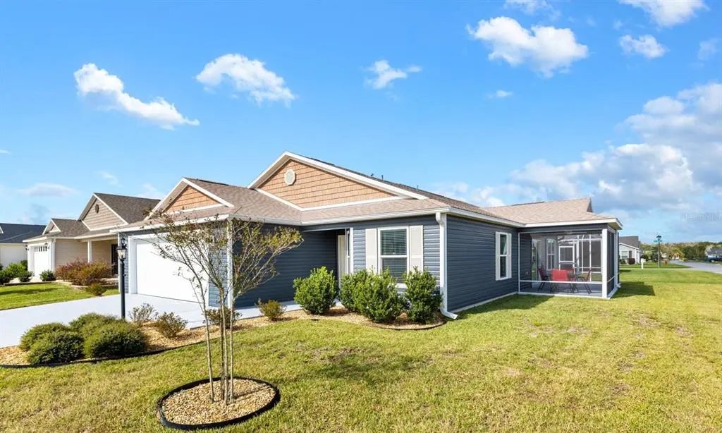 TURNKEY!! Welcome to this charming 3 bedroom, 2 bath, LARGE 2 car garage, cottage style, AT EASE model home in the Village of Citrus Grove! This LIKE-NEW home COMES TURNKEY WITH LOVELY FURNITURE AND SOME KITCHEN ITEMS! It is conveniently located right down the street from the HOMESTEAD RECREATION CENTER,WALKING/BIKING PATHS, NATURE TRAILS, DOG PARK, PICKLEBALL & TENNIS COURTS, BOCCE BALL, SHUFFLE BOARD, AND A STAR GAZING AREA! The POSTAL STATION and NEIGHBORHOOD POOL is a short ride away. Only 5 minutes to THE MARKET AT SAWGRASS GROVE and MCGRADY'S PUB. It's less than 30 minutes in your golf cart to BROWNWOOD PADDOCK SQUARE and will be 15 minutes away from the newest town square of EASTPORT. Situated on a corner lot, this home has the LANAI and EXTENDED BIRDCAGE with a slider door leading to it along with a TABLE and CHAIRS. Waterproof rolled vinyl flooring thru the kitchen and living room. Stainless steel appliances are included with a GAS STOVE, FRENCH DOOR refrigerator, and the dark cabinetry contrast nicely with the crisp white wall color. The island is perfect for entertaining with 4 beautiful bar stools. A PANTRY CLOSET provides plenty of space for your kitchen needs. The living room IS TASTEFULLY DECORATED WITH FURNITURE including a LEATHER COUCH and ENTERTAINMENT CENTER WITH A FLAT SCREEN TV. EVERYTHING that is currently in the home is INCLUDED with this price. Split floor plan provides privacy with the primary bedroom suite. DUAL SINKS in the master bath, large 7.7 x 8.8 WALK-IN CLOSET. The 2nd bedroom has a full size bed and MID-CENTURY inspired furniture. A nice DESK sits in the 3rd bedroom. The 2-car garage is 24.4 x 21.4 and has a SLOP SINK for your convenience of cleaning your golf clubs and tools. NEW GARAGE ENTRY PAD and NEW IRRIGATION METER. Don't miss this great opportunity to enjoy the great lifestyle of The Villages, call for a private showing today!