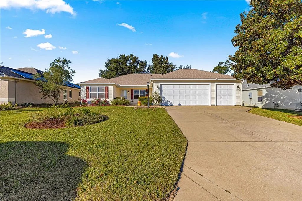 WOW! REDUCED $20,000! NO BOND! Gorgeous 3 bed 2 bath Carolina III model. Open floor plan with large front windows overlooking stunning lake! Florida room with large windows overlooking Mira Mesa golf course hole #5. Roof replaced in 2022, NEW hot water tank. White kitchen cabinets with matching white appliances. GAS stove. Large kitchen island with quartz counters. Updated primary bath with newer walk in shower. Primary bedroom with dual walk in closets. Large 2 car garage with GOLF CART GARAGE. Large mature trees in rear of home overlooking golf course. Recently all furniture has been removed. Minuets from shopping, dining and entertainment at either Lake Sumter or Spanish Springs Squares.