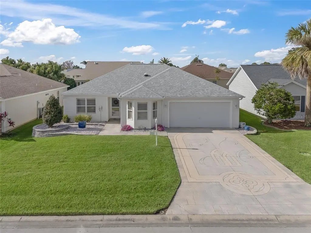 Welcome to Your Dream Home in the Village of Santo Domingo! NO BOND! Nestled in the heart of The Villages, this meticulously maintained Wisteria Model is a true gem. From the moment you arrive, you'll be captivated by the beautiful, hand-designed and painted driveway that sets the tone. The lush lawn and pristine landscaping add to the home's incredible curb appeal, creating such a welcoming atmosphere. Step inside and be greeted by a bright and airy interior, featuring vaulted ceilings that elevate the living spaces. The luxury vinyl plank flooring(2020) flows seamlessly throughout the home, while plantation shutters provide an elegant touch and allow for optimal natural light control. Recent updates include a new roof (2023), HVAC system (2023), and hot water heater (2022), ensuring peace of mind for years to come. Conveniently located just minutes from shopping, restaurants and medical facilities. The Savannah Center is just minutes away, offering a wide array of amenities including Theatre, poolside relaxation, pickleball, tennis, bocce ball, and shuffleboard, ensuring endless entertainment. Golf lovers will appreciate the proximity of the Glenview Country Club & Championship Golf Course, Hacienda Hills Championship Golf Course and El Santiago and El Diablo Executive Golf Courses, perfect for leisurely rounds just a stone's throw away. Spanish Springs Town Square is only 6 minutes away and Lake Sumter Landing is 12 minutes, where you'll find an abundance of dining, shopping, and nightly entertainment options. Don't miss the opportunity to own this beautifully maintained home, schedule your private showing today. 2013 Electric Golf Cart is included with the sale.