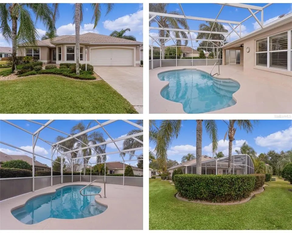 EXPANDED Jasmine with HEATED POOL on a CUL DE SAC LOT in the Village of Belvedere! Fall in love with this block and stucco exterior, nestled on a spacious oversized lot. Step inside through the front entryway and be greeted by a stained-glass door with side panel, setting the tone for the beauty within. The home features PLANTATION SHUTTERS THROUGHOUT and LAMINATE flooring through the main living areas, with carpet in the bedrooms and tile in the kitchen and baths. NO POPCORN! This home boasts knockdown textured ceilings throughout the home. To your right, the kitchen has Corian countertops, pull-out drawers in all cabinets, a GAS range, matching Maytag appliances, and additional counter and cabinet space. Well-placed windows create a sunny breakfast nook for more casual dining. The spacious dining room easily accommodates six, while the vaulted ceilings in the living room add a sense of space. Beyond the living area, a cozy sunroom awaits, featuring a stained-glass window in the door to the fantastic pool area. The outdoor area boasts painted, textured concrete flooring open to the sparkling heated pool. The pool has a remote-controlled light system and is surrounded by a birdcage with lighting and privacy panels, perfect for outdoor entertainment or relaxation. The primary bedroom has a sliding glass door to the birdcage, a walk-in closet, and an en-suite bath with a pocket door. The two guest bedrooms have double-door closets and access to a well-appointed guest bath. The laundry room features cabinets, a deep sink, and a washer and dryer behind a pocket door. The two-car garage has epoxy floors, pull-down attic stairs, and a remote screen door. Enjoy peace of mind with a NEW ROOF (2022), HVAC (2016), and gas water heater (2018). LOW BOND! Located near the Pimlico Family Pool and Recreation Center, Belmont Executive Golf Course, and Bonnybrook Pool, this home is also a short drive from shopping, dining, medical facilities, and the vibrant Lake Sumter Landing. Come see why this should be your next home!