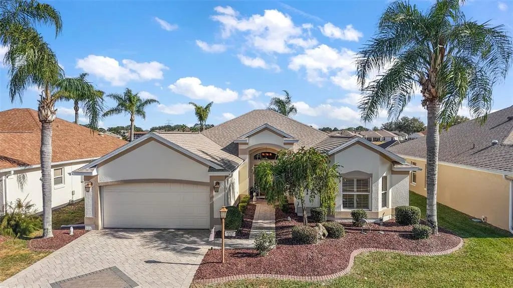 DESIGNER HOME WITH BREATHTAKING WATER VIEWS – BOND PAID! FULL TURNKEY [Optional]! Welcome to this stunning 3/2 waterfront home in the highly sought-after Village of Palo Alto, offering unparalleled water views and an exceptional living experience. From the moment you arrive, the concrete-stucco exterior, enhanced landscaping, and elegant paver driveway and walkway create undeniable curb appeal. Step inside to a spacious open-concept and immediately take in the waterview in the distance beyond the living area featuring vaulted ceilings that enhance the home’s bright and airy feel. Sliding glass doors lead seamlessly to the tiled Florida Room, where floor-to-ceiling windows provide a breathtaking 180-degree water view - a perfect spot to relax and soak in the serene beauty. Step outside, and you’ll discover the true highlight of this home—a charming outdoor patio off the side of the Florida Room, where you can enjoy tranquil water views while sipping your morning coffee or entertaining guests in a picturesque setting. Adjacent to the living room, the dining area is ideally situated between the kitchen and living space, making it perfect for entertaining. The chef’s kitchen boasts a breakfast bar, upgraded appliances, and abundant cabinetry, ensuring both style and functionality. Retreat to the primary suite with a pair of windows taking advantage of the water view, designed for ultimate comfort with private access to an en-suite bathroom with a walk-in shower containing a built-in bench and elegant glass doors, a large designer tub plus an oversized walk-in closet for ample storage. Privacy prevails as another hallway leads to the spacious second bedroom featuring a charming curved bay window, a ceiling fan, and a built-in closet, plus there is a third bedroom that is equally inviting with a large window and built-in closet. The two bedrooms share a guest bathroom containing a tub/shower combo and a single vanity/storage that adds extra convenience. The expanded garage offers room for two cars, a golf cart [or two], and additional storage space. A Prime Location! You are just a short golf cart ride to Spanish Springs and Lake Sumter Landing, and are close to Tierra Del Sol Country Club & Championship Golf Course, Hacienda Championship Golf Courses, Hacienda Regional Recreation Center, pools, pickleball courts, The Villages Regional Hospital, shopping, and dining. RECENT UPDATES: Roof (2020) | A/C (2023) | Water Heater (2020) | Washer & Dryer (2018) This exceptional home is more than just a place to live—it’s a peaceful retreat with unbeatable waterfront views. Don’t miss your chance to own this gem! Call today to schedule your private showing or virtual tour!
