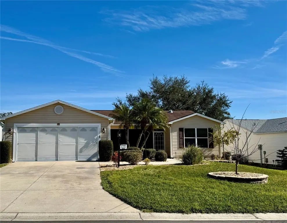 BOND PAID on this Amarillo with FLORIDA ROOM in The Village of Chatham. As you arrive, you'll be charmed by the beautiful curb appeal with well-maintained palms and shrubbery. Imagine starting your day on the Screened in covered front porch with coffee and the morning newspaper. Step inside and be greeted by the elegance of 16 inch TILE flooring that flows seamlessly throughout the home. The VAULTED ceiling with knock down texture ( no Popcorn )adds a spacious and airy feel to the home. The dining room, adorned large arched opening, leads you to the enclosed FLORIDA ROOM—an ideal space for a den, office, or any purpose you desire. The kitchen boasts Raised Panel Oak cabinets with double pullout shelves on lower cabinets, a convenient breakfast island and a 12 inch Solar Light. This popular split floor plan offers privacy and comfort. The Primary bedroom suite, located on one side of the home, features a walk-in closet and ensuite bathroom. On the opposite side, the guest area includes a front bedroom with a double-door closet, a guest bath with a tub/shower combo and a Solar Light, a hallway linen closet, and a second bedroom w/double door closet. The convenience continues with an inside laundry room that offers floor to ceiling;ing cabinets and opens to a spacious two-car garage. Newer Roof 2012, HVAC 2015 and Tankless hot water heater .Convenient location close to NANCY LOPEZ LEGACY CC. with easy golf cart access to shopping, dining, and The Villages amenities. For golf lovers, there are four 9-hole executive golf courses and two 27-hole championship golf courses nearby. Both country clubs for championship golf also offers fine dining. For water lovers, this location is very close to the ADULT ONLY neighborhood pool, neighborhood rec centers (with family pool), and one regional rec center (Mulberry) that has a sports pool and fitness Center, pickleball & Tennis courts, shuffleboard, and bocce. The new First Responders rec center (opened in 2021) is only minutes by golf cart. This rec center offers a game room, pickleball and platform tennis courts, a fire pit, lawn bowling, a basketball court, and a fun and challenging 18-hole putting golf course. Call today to see why this should be your next home!