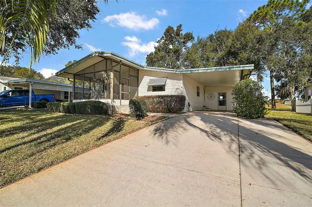 As you walk into this well maintained 2 bedroom 2 bath home you notice the bright and airy feel from its open floor plan enhanced by the volume ceilings, natural light, and laminate flooring throughout. The living area is enhanced with its proximity to the covered screen front porch and and adjoining dining area that leads to the kitchen. The kitchen with natural light provided by the front bank of windows has plenty of counter space and storage and even has a breakfast bar for those quick meals. The primary bedroom suite is located to the back of the home and contains a large walk-in closet with access to a large bath area which includes two sinks. The second bedroom has great access to the guest bathroom via the extra wide hallway which also leads to the indoor laundry room. To the back of the carport you access a large storage area affording you plenty of options for your needs. The Fox Run 55+ community offers a full social calendar of activities and amenities for a reasonable monthly fee. Enjoy access to the "Harris Chain of Lakes" via the community marina or boat ramp or just enjoy the day by one of the two pools with friends. Don't delay, call to arrange a showing to see this home.