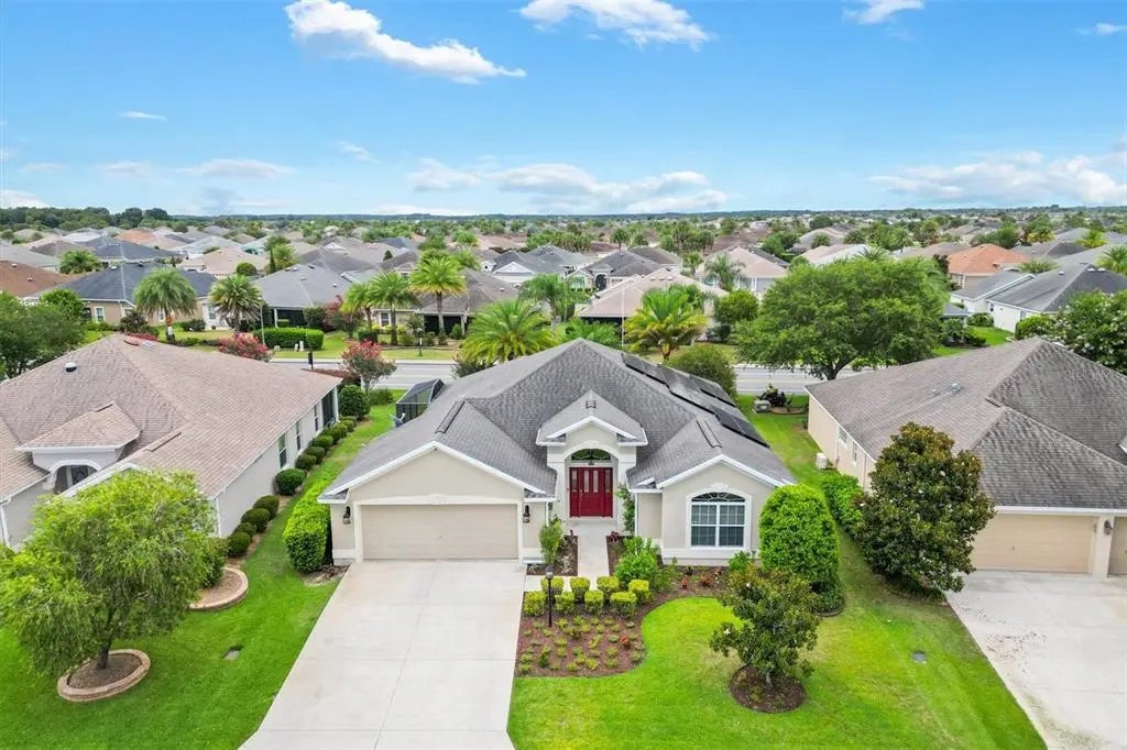 STUNNING, ENERGY EFFICIENT, 3/2 LILY with a 2 car garage, EXPANDED 29x11 GLASS ENCLOSED LANAI under HEAT/AIR bringing the total SQUARE FOOTAGE to 2155 sq ft. Located down a CUL-DE-SAC street in the very sought after VILLAGE OF SANIBEL! New HVAC, WATER HEATER & Paint 2024. Greeted by a LEADED GLASS front door insert with side lites and an arched transom window. OPEN FLOOR PLAN with TILE ON THE DIAGONAL is found throughout the living & dining area, kitchen, laundry, and baths. ENGINEERED HARDWOOD flooring in the primary bedroom and LUXURY VINYL PLANK FLOORING in the guest bedrooms. NO CARPET in this home. Kitchen boasts STAINLESS STEEL APPLIANCES and GRANITE counter tops including a BREAKFAST BAR, PULL OUT DRAWERS, lazy susan corner cabinet and PANTRY. The casual dining area and the living room open with SLIDING GLASS DOORS out to the GLASS ENCLOSED LANAI under HEAT/AIR PLUS a screened birdcage off the lanai. Primary bedroom has a TRAY CEILING, En-Suite Bathroom with GRANITE COUNTERS, Make-up Area, Dual Sinks, TILED ROMAN SHOWER, Walk-in Closet and a private toilet. The Guest Wing has a POCKET DOOR Entry & LINEN CLOSET -- Bedrooms 2 and 3 have LVP, ceiling fans and closets. Guest bathroom has GRANITE counter & tub/shower combo. INSIDE LAUNDRY ROOM has a Utility Sink with Granite, wall mounted Cabinets and EXTRA ROOM for an office, extra fridge or make it your own. Garage features wire shelves, pull-down attic stairs & HVAC Closet!! Don't forget 36 SOLAR PANELS tied into your system to provide little or no electric cost=ENERGY EFFICIENT. Roof has been inspected and certified. (See paperclip) CAPTIVA POOL/RECREATION and SANIBEL POOL/RECREATION & MAIL STATION are right down the street. Other nearby recreation centers include: BRADENTON, CHARLOTTE, MANATEE. You are near BONIFAY Golf & County Club/SARASOTA Golf Practice & Driving Range. WALMART Neighborhood Marketplace is 1.4 miles away. BROWNWOOD Town Square is 3.2 miles away and LAKE SUMTER LANDING is 3.4 miles away. RING DOORBELL and camera on garage included. Don't forget to watch the video and make your appointment NOW to start LIVING THE DREAM!