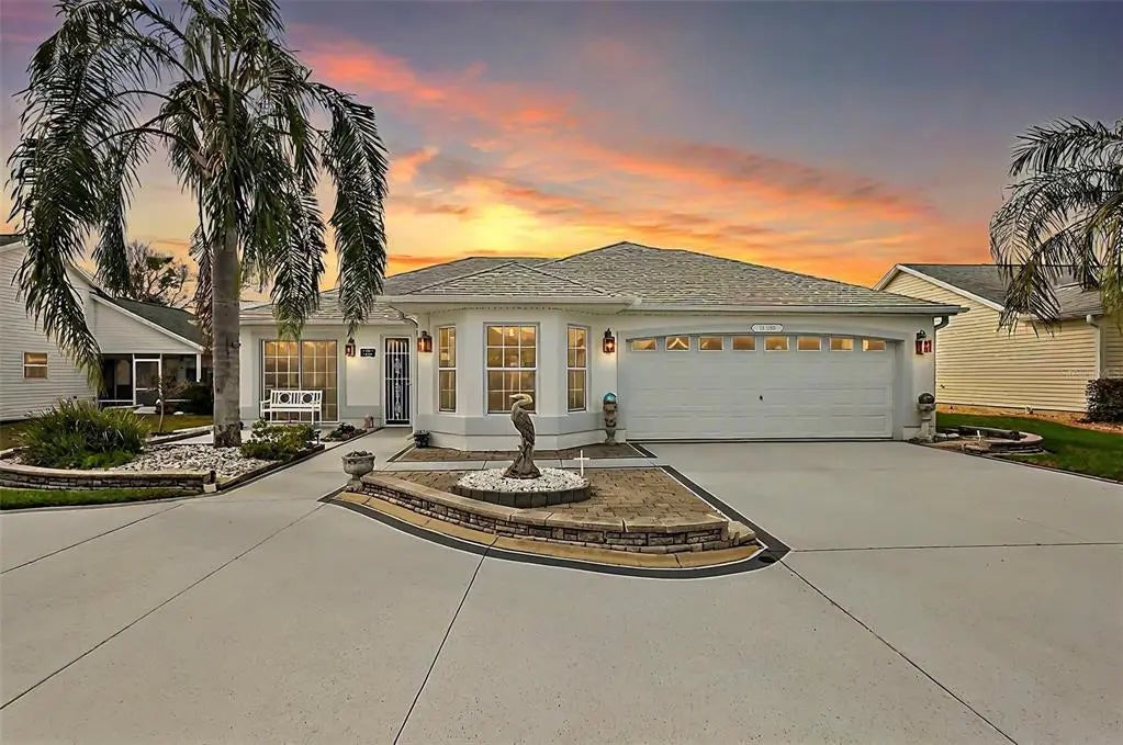 Located in the stunning village of Santo Domingo, this 3/2 Jasmine boasts a PAID BOND, NO CARPET, and rear privacy. It welcomes you with a painted driveway featuring paver landscaping detail, lush Florida landscaping, and a charming blue front door with a custom glass insert. Inside, the spacious kitchen offers plenty of cabinetry, a NEW REFRIGERATOR, GRANITE COUNTERTOPS, WHITE APPLIANCES, and a large breakfast nook with bay windows. The open-concept living room boasts tall ceilings, sliding doors to the lanai, and flows seamlessly into the dining room. The primary bedroom features a walk-in closet and an en suite bathroom with dual sinks and a walk-in shower with a glass door. Bedroom two includes double bifold doors to the living room, a built-in closet, and a designer ceiling fan, while bedroom three offers a built-in closet and sliding doors leading to the front patio area. The guest bath has a single vanity and a walk-in shower with glass doors. The screened lanai showcases stamped concrete flooring, an extended NEWLY screened area for extra space, and a ceiling fan, while the adjacent patio is perfect for a grill. Enjoy added privacy with mature privacy hedges. Updates include a newer roof, 2014 water heater, and 2022 HVAC. Conveniently located near Spanish Springs Town Square, Lake Sumter Landing, Hacienda Championship Golf Course, Tierra Del Sol Country Club and Championship Golf Course, La Hacienda Regional Recreation Center, the neighborhood pool and recreation center, 441 and 466 shopping and restaurants, and The Villages Regional Hospital. PLEASE WATCH OUR WALKTHROUGH VIDEO OF THIS UPDATED HOME IN A FANTASTIC LOCATION, and CALL TODAY for your private showing or virtual tour!
