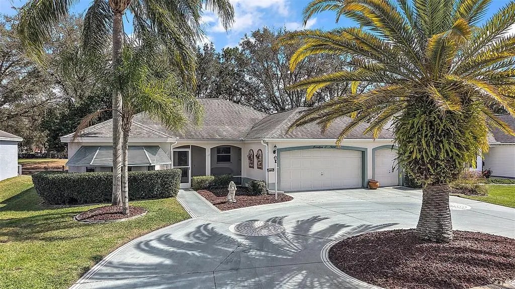 GOLF FRONT, NO BOND, and JUST ONE BLOCK to Spanish Springs Town Square! This beautiful 3/2 Vera Cruz model in the Village of Hacienda East boasts a fantastic GOLF VIEW of Hole 4 of The Oaks course at Hacienda Hills Golf and Country Club, providing picturesque backdrop with majestic live oaks and lush fairways. Featuring an ENCLOSED LANAI and a TWO-CAR + GOLF CAR garage, this home combines luxury and functionality in one of The Villages' most desirable locations. The circular painted driveway, lush Florida landscaping, and view of the golf course create a welcoming first impression. The front exterior is highlighted by a screened front entry leading to a spacious foyer with a practical coat closet. The kitchen boasts WHITE cabinetry, Corian countertops, a FULL PANTRY closet, and a dinette with three bay windows accented by plantation shutters. The OPEN CONCEPT living room is bathed in sunlight from double skylights and sliding doors leading to the CLIMATE-CONTROLLED FLORIDA ROOM with zero-threshold (no step down) tile flooring. VOLUME and VAULTED CEILINGS throughout the living, dining, and primary suite create a spacious feeling; while WOOD FLOORING in the living, dining, kitchen, and primary bedroom offer a timeless look. Off the foyer, a separate HOME OFFICE space provides privacy and functionality. The primary bedroom includes a WALK-IN closet and an en suite bathroom with white cabinetry, dual split sinks, a makeup/vanity space, and a walk-in shower. Bedrooms 2 and 3 feature large windows and built-in closets, with Bedroom 2 also offers private access to the Florida room. The guest bathroom includes a single vanity and a jacuzzi tub/shower with a glass block window. The spacious acrylic-ENCLOSED LANAI offers PANORAMIC VIEWS of the golf course, with tile flooring, a designer ceiling fan, and the ability to open the sliding panels to let in the breeze—creating the PERFECT space to enjoy the outdoors year-round. The adjoining patio is ideal for grilling or enjoying an evening glass of wine, complete with mature trees for shade and a Meyer lemon tree. The garage provides space for both cars and a golf cart, along with a workbench and some cabinets for storing golf clubs that stay. Additional features include ATTIC STORAGE above the garage and a CENTRAL VACUUM system throughout the home. This exceptional home is located just minutes from Spanish Springs Town Square (A shortcut at the end of Barcelona Drive provides easy access to the square.), La Hacienda Recreation Center, Chula Vista Recreation Center, and Lake Sumter Landing Market Square, offering retail, dining, and entertainment options. With easy access to major roads like US-441/27 and CR-466, you’re perfectly situated for shopping, dining, and medical facilities, as well as countless recreational opportunities. Enjoy the close proximity to Hacienda Hills Golf & Country Club’s 27-hole championship course, where water hazards and bunkers challenge golfers at every turn. PLEASE WATCH OUR WALKTHROUGH VIDEO OF THIS DESIGNER HOME IN A FANTASTIC LOCATION, and CALL TODAY for your private showing or virtual tour!