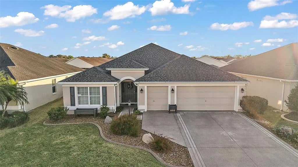 Motivated seller. Not your average Designer Home! This 3/2 Iris model, located in the central Village of Buttonwood, sits on a PREMIUM lot, providing a rare level of PRIVACY and NO “KISSING LANAIS” thanks to a tasteful concrete wall. Coupled with a magnificent paved PATIO, pergola, and raised garden area, you can enjoy the beautiful Florida weather in peace and quiet. Additionally, the BOND is PAID (a savings of about $13,400) and the home features a BRAND NEW ROOF (2025), offering peace of mind for years to come. The stunning front exterior features a 2 CAR + GOLF CART GARAGE with a custom-PAINTED DRIVE and WALKWAY, pebble and paver landscaping with lush Florida greenery, and a front door framed by double sidelights and a transom window. Step inside to an inviting open foyer with an arched entrance leading to the main living area. The kitchen boasts wood cabinets, STAINLESS appliances, a full CLOSET PANTRY, and cozy dinette. The dining room sits between the kitchen and living room, where a built-in fireplace with a mantle adds warmth and charm, and seamless access to the 225-square-foot BONUS ROOM. This bright and airy space is framed by beautiful, CUSTOM MOLDING and CORNICES at each entrance, paned windows spanning the entire room, pull-down shades, and a small fireplace; while a glass door leads to the private patio. The combined laundry room and office is thoughtfully designed with wood cabinetry above and beside the washer and dryer, a UTILITY SINK and vanity, along with a custom-built DESK. The primary bedroom features walk-in closets, a tray ceiling, and an en suite bath with split vanities, a makeup/vanity space, a private water closet, and a walk-in shower with a built-in seat and glass door. The second bedroom includes a tray ceiling, a built-in closet, and a double window, while the third bedroom showcases a custom-built MURPHY BED with side cabinets, a built-in closet, and a custom wall-folding table. The guest bathroom offers a single vanity and a separate tub/shower combo. For those seeking additional conveniences, the living room entertainment center and electric golf cart are available for purchase separately, offering even more opportunities to enhance your Florida lifestyle. The Village of Buttonwood is conveniently located between Lake Sumter Landing and Brownwood Paddock Square, offering residents easy access to shopping, dining, and entertainment. Nearby amenities include the Buttonwood Recreation Center, featuring an adult pool, bocce, horseshoes, and shuffleboard courts; SeaBreeze Regional Recreation Complex, with a sports pool, pickle ball and tennis courts, and more; as well as golf courses such as Red Fish Run and Tarpon Boil, all just a short golf cart ride away! PLEASE WATCH OUR WALKTHROUGH VIDEO OF THIS BEAUTIFULLY UPDATED HOME IN A FANTASTIC LOCATION, and CALL TODAY for your private showing or virtual tour!
