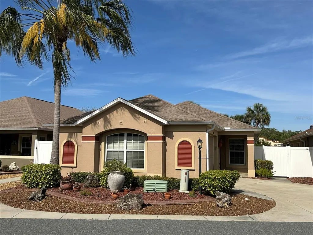 NO BOND! Step into elegance with this stunning 3-bedroom, 2-bathroom Anaheim model Courtyard Villa, just steps from the popular Mission Hills Pool. Nestled in the heart of The Villages, Haciendas of Mission Hills is a peaceful and private neighborhood that offers the best of both worlds—serenity at home and shopping, dining, and live entertainment just 3 minute golf cart ride to Lake Sumter Landing Town Square. Inside, this beautifully appointed home features tile flooring in the kitchen and luxury vinyl plank throughout. Crown molding in the kitchen and main living areas adds a touch of sophistication. The open floor plan creates a seamless flow from the kitchen to the dining and living areas, making it perfect for entertaining. The expanded primary suite provides additional space, while the bathroom boasts a walk-in shower with gorgeous finishes. Three solar tubes in the kitchen and bathrooms bring in natural light, enhancing the home's bright and inviting atmosphere. For added convenience, enjoy an indoor laundry room with a sink and an extended screened-in lanai—the perfect spot to relax or entertain in your private backyard oasis. NO BOND! Turnkey package & Yamaha Gas Golf Cart available for separate purchase. This exceptional home won’t last long—schedule your private showing today!