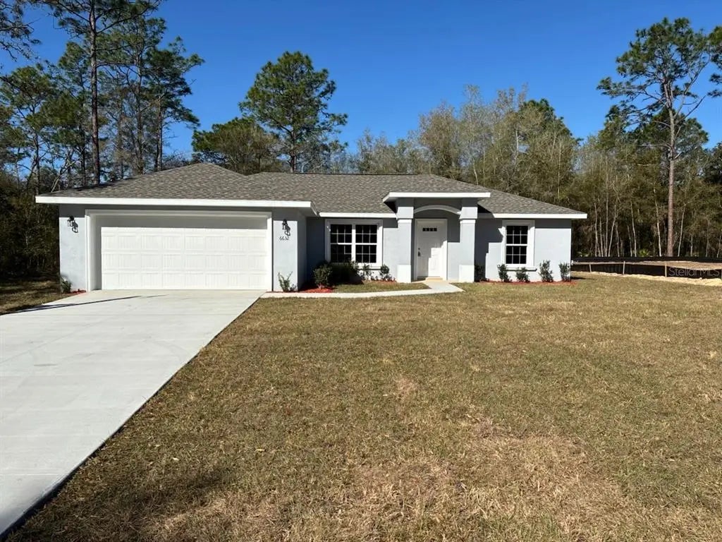 NEW CONSTRUCTION! MOVE-IN READY! Don’t miss your chance to own this brand-new Islamorada Model home in Citrus Springs. This stunning 3-bedroom, 2-bathroom residence is built with durable cement block construction, topped with a 30-year architectural roof, and designed with a vaulted ceiling in the living room for an open and airy feel. The modern kitchen boasts custom white shaker cabinets with soft-close drawers, a large island with a sink and dishwasher, black granite countertops, a beautiful white subway tile backsplash, and an expanded cabinet package with wrap-around cabinets over the fridge and additional storage in the laundry room. Luxury vinyl plank flooring extends throughout the entire home, complemented by high-end light fixtures and double-pane windows. The master bath features elegant tile flooring and a tile shower with a glass enclosure. Enjoy outdoor living on the covered back porch, and take advantage of the convenience of a garage door opener with remotes. This home also comes with an aerobic septic system and a 10-year structural warranty. Why deal with the hassles of a pre-owned home when you can move into this stunning new build at an unbeatable price?