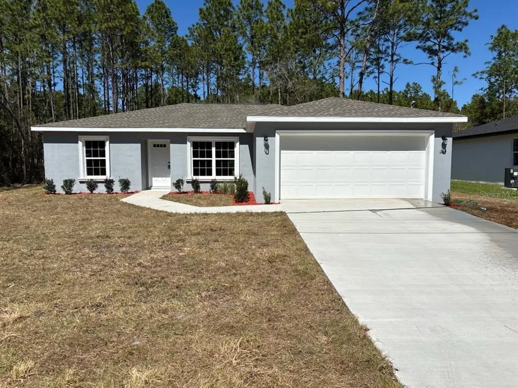 MOVE-IN READY NEW CONSTRUCTION HOME in Citrus Springs! This stunning Key West Model offers 3 bedrooms, 2 bathrooms, and a range of high-end finishes designed for both style and comfort. Built for durability, the home features concrete block construction, a 30-year architectural roof, energy-efficient double-pane windows, and a 10-year structural warranty. The vaulted ceiling in the spacious living area enhances the open, airy feel, while the modern kitchen boasts stainless steel appliances, custom white shaker cabinets with soft-close drawers, a pantry, sleek black granite countertops, and a beautiful white subway tile backsplash. Luxury vinyl plank flooring runs throughout, including in the generously sized master suite—the builder’s largest master bedroom model—which features an upgraded en suite bath with elegant tile and a glass-enclosed shower. Additional highlights include an attached 2-car garage with opener and remotes, a tub/shower combo in the main bathroom with upgraded tile, and a covered patio perfect for enjoying Florida evenings. With no HOA fees and a location in flood zone X (no flood insurance required), this home offers exceptional value in the desirable Citrus Springs community. Don’t miss this opportunity to own a brand-new home!