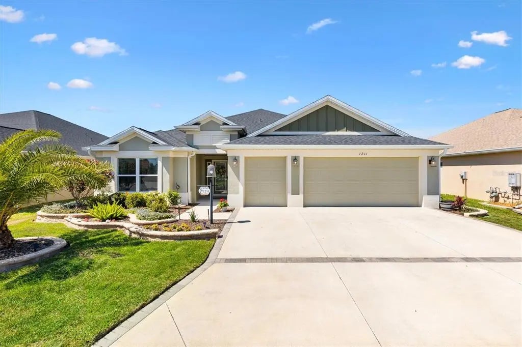PRICED TO SELL!!! ROOM FOR A POOL. VERANDA MODEL Discover the perfect blend of comfort and elegance in this stunning 3-bed 2-bath Hudson Home located in the Village of Hawkins. As you approach, the covered entry welcomes you to a beautifully crafted stained glass front door, complemented by a durable storm door for added protection. Step inside to an inviting foyer leading to an open and split floor plan, ensuring privacy with guest bedrooms conveniently situated at the front of the home. The guest area features a pocket door for added convenience and shares a well-appointed bath complete with a tub-shower combo, making it ideal for family and friends. Throughout the home, you'll find stunning ceramic tile floors that add both beauty and easy maintenance. The heart of this home is its spacious living and dining room, perfect for entertaining or relaxing with loved ones. The kitchen is a chef's dream, boasting an island with a breakfast bar, stainless steel appliances, a gas stove, and pull-out cabinet shelves for easy access to your essentials. Under-cabinet lighting, including a soft glow along the floor, enhances the ambiance while showcasing the stunning quartz countertops. The private primary bedroom offers a serene retreat, complete with a tray ceiling for added elegance. The ensuite bath is equally impressive with a glass-enclosed shower with bench, split dual vanity, and a separate water closet. The large walk-in closet provides plenty of storage, completing the primary suite's appeal. Step outside to the screened-in lanai, where you can unwind in comfort, or entertain friends and family. The spacious backyard is fully fenced for privacy and offers room for a pool, allowing you to create your perfect outdoor oasis. The patio is perfect for grilling and dining al fresco, making it an entertainer's paradise. Additional features of this exquisite home include triple crown molding, ceiling fans for comfort, decorative cornices over sliding doors, a whole house water filtration system, and a convenient entry hall closet. You are walking distance to the Aviary Recreation Center and Pool and the Hawkins Adult Pool. Sawgrass Center is just 5 minutes by golf cart and under 2 miles to 6 golf courses with Southern Oaks Championship golf course just 1 mile away. Don’t miss the opportunity to make this home yours. Be sure to watch our video of this home and schedule your showing so you can start living The Villages dream.