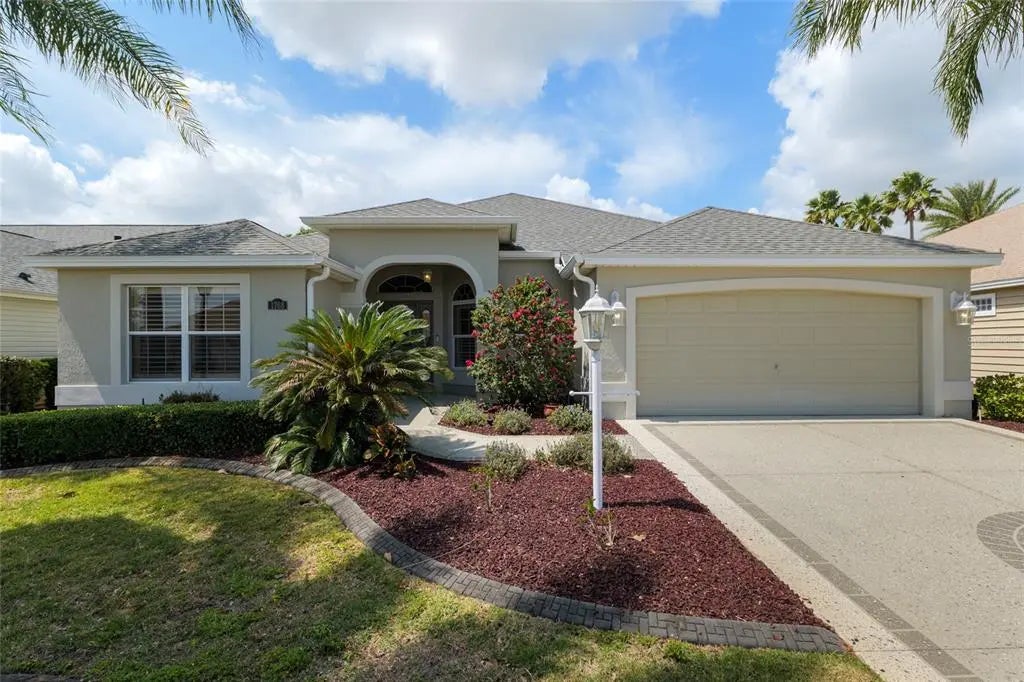 ~2022 ROOF, HVAC, and HOT WATER HEATER~ ~PLANTATION SHUTTERS~ ~CROWN MOLDING~ ~ALL NEW GUTTERS~ ~GLASS ENCLOSED LANAI~ ~PARTIAL FURNITURE PACKAGE INCLUDED~ ~2022 YAMAHA GOLF CART SOLD SEPARATELY~ Come see this charming Gardenia on a private lot in Mallory Square. Upon entering, you’re greeted by HIGH, VAULTED CEILINGS and elegant PLANTATION SHUTTERS, creating a spacious and refined atmosphere. The living room boasts LUXURY VINYL FLOORING, UPGRADED LIGHTING, a stylish ceiling fan, and CROWN MOLDING, adding a touch of sophistication. Adjacent to the living area, the dining room continues the upscale aesthetic with its high ceiling, crown molding, and matching LUXURY VINYL floors—perfect for hosting elegant dinners. The eat-in kitchen is both stylish and functional, featuring CERAMIC TILE floors, CORIAN countertops, and UPGRADED STAINLESS STEEL appliances. The space is enhanced with under-cabinet and over-cabinet lighting, creating a warm and inviting ambiance. The primary suite has NEW CARPET, VAULTED CEILINGS, and UPDATED LIGHTING. A ceiling fan adds comfort, while 2 WALK-IN CLOSETS provide ample storage space. The ensuite bath is equally impressive, featuring CERAMIC TILE flooring, a TILED ROMAN SHOWER, a linen closet, and DOUBLE SINKS with CORIAN counters. A SEPARATE COMMODE adds extra privacy. Guests will feel right at home in the guest bedroom, which includes a ceiling fan, updated lighting, crown molding, and a built-in closet. The guest bath is designed with ceramic tile, a TILED SHOWER/TUB COMBO, a linen closet, and CORIAN counters. An additional guest space with carpet, plantation shutters, and crown molding offers even more flexibility, perfect for a home office, den, or extra bedroom. The INDOOR LAUNDRY ROOM is equipped with ceramic tile, a LAUNDRY TUB, and cabinets for added storage, making daily chores a breeze. The GLASS-ENCLOSED LANAI is a true highlight of the home. Featuring LUXURY VINYL FLOORS, blinds, and two new ceiling fans, this versatile space is ideal for year-round enjoyment, providing a perfect spot to relax and take in the tranquil surroundings. Finally, the PAINTED DRIVEWAY leads to a 2-car garage featuring EPOXY floors and convenient attic stairs for extra storage. The private lot that has been meticulously maintained providing added seclusion while being just s short distance away from the Mallory Championship Country Club and Restaurant, Havanna Country Club and Restaurant and the Odell Rec Center. It is a short golf cart ride to Lake Sumter Landing, restaurants, shopping and medical.