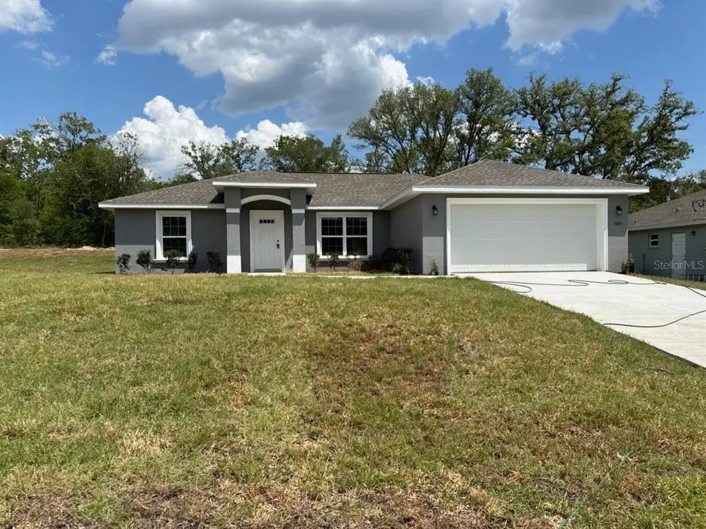 NEW CONSTRUCTION. MOVE-IN READY! This beautiful Islamorada model in Citrus Springs offers 3 bedrooms, 2 bathrooms, and 1,438 square feet of thoughtfully designed living space. Built with durable concrete block construction and topped with a 30-year architectural shingle roof, this home combines quality with comfort. Inside, you'll find luxury vinyl plank flooring throughout, a vaulted ceiling in the living room, and energy-efficient double-pane windows that let in natural light. The kitchen features custom white shaker cabinets with soft-close drawers, dark gray granite countertops, a stylish subway tile backsplash, a full cabinet package, a pantry, and stainless steel appliances. Both bathrooms include granite counters and upgraded marble-look tile, with a glass-enclosed shower in the master and a tub/shower combo in the main bath. Additional perks include a laundry room with extra cabinetry, a covered patio for relaxing outdoors, and an attached 2-car garage with opener and remotes. Located in flood zone X—this high and dry property requires no flood insurance. Plus, there are no HOA fees, giving you extra freedom and flexibility in a growing Citrus County community.