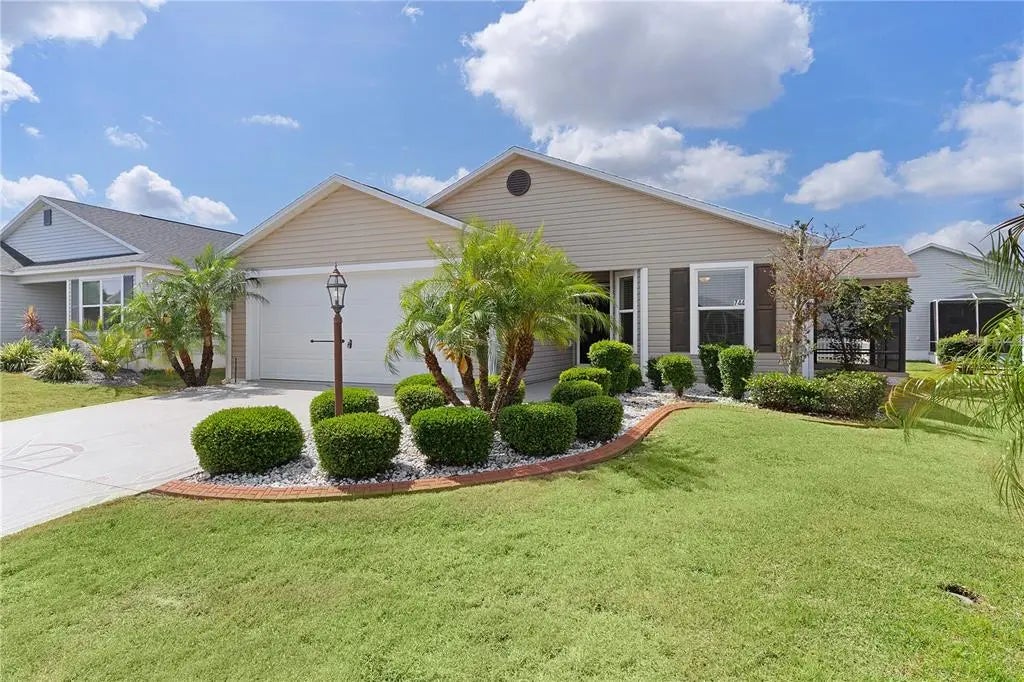 ~2015 ROOF, HVAC & HOT WATER HEATER~ Welcome to this beautifully maintained 3/2 AT EASE III model located in the much sought-after Village of PINE RIDGE! This charming home offers curb appeal and character from the moment you arrive, with STONE ACCENTS, manicured shrubbery, curb edging, and a PAINTED DRIVEWAY featuring a compass mural. Step inside to an OPEN FLOOR PLAN with HIGH, VAULTED CEILINGS and stylish LAMINATE FLOORING that mimics the charm of reclaimed barn wood. The spacious living area has UPDATED CEILING FANS and lighting and flows seamlessly into the kitchen, which features ample cabinetry, HI-DEF COUNTERTOPS, a LARGE PANTRY, and a cozy breakfast nook. The spacious primary bedroom features cozy carpet flooring and a LARGE WALK-IN CLOSET, offering both comfort and convenience. The en-suite bath includes DOUBLE SINKS, laminate flooring, and a walk-in shower. The 2nd and 3rd bedrooms are also carpeted and situated near the guest bath, which includes a tub/shower combo and laminate flooring, ideal for guests or family. Step through the sliding glass doors from the dining area to enjoy your SCREENED-IN LANAI. Just beyond, a charming patio enclosed with a picket fence adding a touch of charm and privacy for entertainment. The indoor laundry room leads directly to a 2-CAR GARAGE with a concrete floor, great for your vehicles, golf cart, or hobby space, complete with shelfing for storage. Enjoy easy access to Belle Glade Country Club (a full 27-hole championship course). The Colony Cottage Regional Recreation Center offers swimming, pickleball, fitness classes, and social events. When it’s time to unwind, hop in your golf cart and head to Brownwood Paddock Square or Lake Sumter Landing Market Square for delicious dining, live music, medical and seasonal events—all just a short ride away!