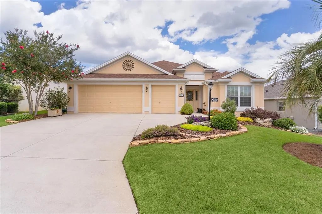 ~PRICE REDUCTION~ ~NO BOND~ ~2024 ROOF~ ~2022 HVAC~ ~NEAR LAKE SUMTER LANDING~ This beautifully maintained 3/2 IRIS in the Village of AMELIA sits on an offset lot framed by mature palm trees and lush shrubbery, offering excellent curb appeal and added privacy. Walk up to the decoratively painted concrete entryway and as you step inside, you are greeted with soaring vaulted ceilings, a front hall closet, and ceramic tile flooring that continues through the main living areas. The living, dining, and kitchen areas are enhanced by CROWN MOLDING, while the dining room features charming WAINSCOTING. The kitchen has Hi-Def countertops, STAINLESS STEEL APPLIANCES, under/over cabinet lighting, TILE BACKSPLASH, bottom rollout cabinets, a CLOSET PANTRY, and a cozy eat-in nook with pendant lighting, and blinds. The primary bedroom boasts ceramic tile, a TRAY CEILING, a spacious OVERSIZED WALK-IN CLOSET, and a luxurious en-suite bath with TILED ROMAN SHOWER, private water closet with vanity, DOUBLE SINKS and Hi-Def countertops. Two guest bedrooms feature carpet, ceiling fans, and built-in closets, with a guest bath offering a tile tub/shower combo, linen closet, and HI-Def countertops. Enjoy the ENLARGED INDOOR LAUNDRY ROOM with cabinets, laundry sink, and 2023 LG WASHER/DRYER. Relax on the SCREENED LANAI with tile floors, blinds, ceiling fan, and privacy shrubs—plus a GRILL PAD just outside. Enjoy the spacious 2-car plus GOLF CART GARAGE which also has extra storage in the attic. The Hot Water Heater is 2009. Close to Odell Rec Center and Bacall Rec Center and just up the street is the Mallory Country Club! Lake Sumter Landing, known for its shopping, dining, medical & more, is minutes away!